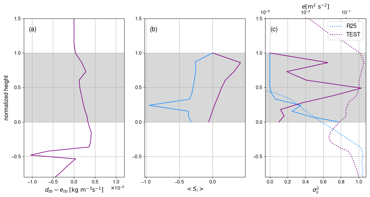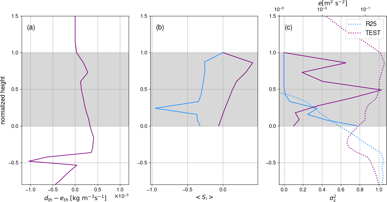 Figure 3(a) M-PACE Vertical profile of net detrainment rate in the TEST simulation (solid line, bottom x-axis). (b) M-PACE vertical profile of the mean in-cloud supersaturation in the R25 (blue) and TEST (purple) simulation. (c) M-PACE vertical profile of the variance of the in-cloud supersaturation (solid lines, bottom x-axis) and of the TKE in the R25 and TEST simulations (dotted lines, top x-axis). In all panels, the vertical axis is the normalized height and grey shading indicates the cloudy area. The profiles shown correspond to the median profiles over the well-developed phase of the clouds, namely between 01:00 and 05:00 UTC, 10 October 2024.