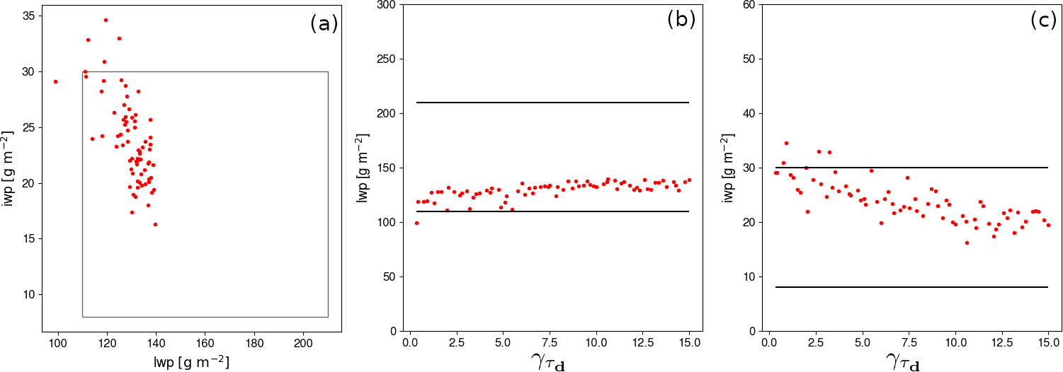 Figure 4(a) Scatter plot of the mean IWP versus LWP during the well-developed phase of the clouds (between 01:00 and 05:00 UTC, 10 October 2024). Each red dot corresponds to one amongst the 70 members of the M-PACE PPE. In panel (b) (resp. (c)) the LWP (resp. IWP) is plotted versus the value of the parameter (see Eq. 11). The rectangle in panel (a) and the black horizontal lines in panels (b) and (c) indicate the likely range of the regionally averaged LWP and IWP from airborne and ground-based observations according to Klein et al. (2009). Note that the simulated IWP includes the mass of snow precipitation and it considers only the first 2000 m above ground level to avoid accounting for mid- and high-troposphere clouds which can be artefacts as they are not the focus of the case.
