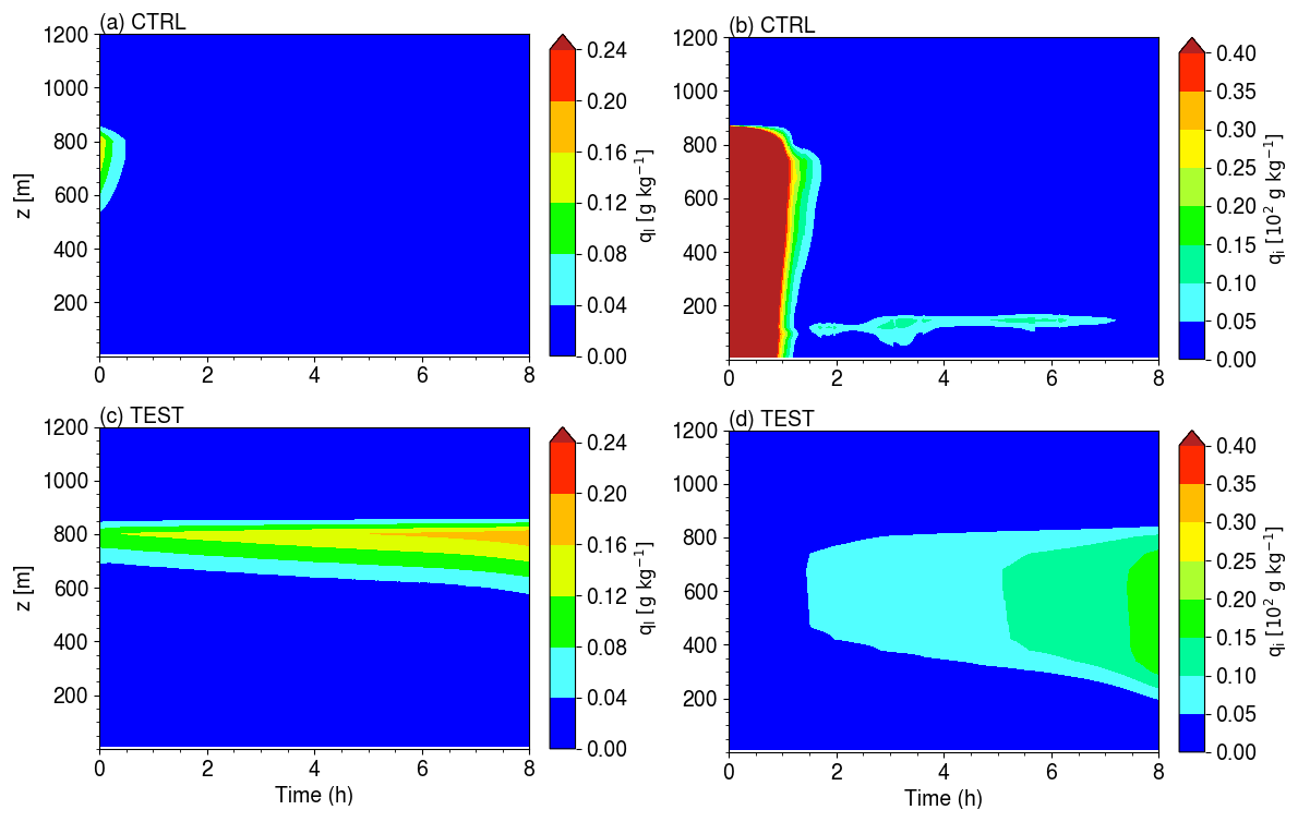 Figure 5Time-height plot of the specific content of cloud liquid water (a, c) and ice water including snow precipitation (b, d) in the CTRL (a, b) and TEST (c, d) LMDZ SCM simulations on the ISDAC case. Colormap and colorbar's levels are the same as those of Fig. 2 in Ovchinnikov et al. (2014) for easy visual comparison with LES results. It is worth recalling that unlike in Ovchinnikov et al. (2014), ice-related processes are allowed from the beginning of the simulations (no 2 h spin-up).
