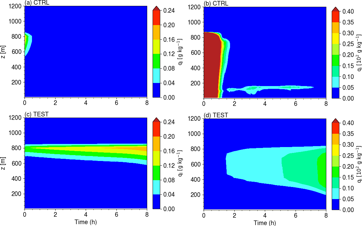 We now evaluate the LMDZ SCM simulations on the surface-decoupled ISDAC case. It is worth noting that shallow convection, triggered by surface convective instability is not activated in the ISDAC simulations and therefore, the R25 and TEST simulation give exactly the same results. This section thus mostly aims to assess whether and how the R25 parameterization helps capture the structure of surface-decoupled MPCs. Figure 5 shows the time evolution of the vertical structure of the specific contents of supercooled liquid droplets and ice crystals in the CTRL and TEST simulations. In the CTRL simulation, the formation of clouds with the temperature-based phase-partitioning leads to a relatively dense cloud of mixed phase composition between 550 and 850 m during the first hour of the simulation Fig. 5a, b). Cloud formation through saturation adjustment with respect to ice results in high in-cloud condensed water contents. In turn, this leads to substantial autoconversion of ice crystals into snowfall and of supercooled liquid droplet into supercooled drizzle, which immediately freezes. Moreover, an excessive ice water content near cloud top - whose temperature ranges between 258 and 260 K – is also expected due to the temperature-based phase partitioning that predicts a cloud ice mass fraction of about 30 % (Madeleine et al., 2020). As a result, high qi values and intense ice precipitation are present from cloud top down to the surface. The consequence is that the cloud condensed water depletes rapidly as there is no water supply. In particular, the absence of significant turbulence below cloud base (not shown) precludes the vertical transport of moisture from low levels up to the cloud. Therefore, the cloud disappears after about one hour of simulation. A shallow ice fog then forms within the stable boundary layer but the overall structure of those clouds does not ressemble the liquid-topped stratocumulus clouds during ISDAC.