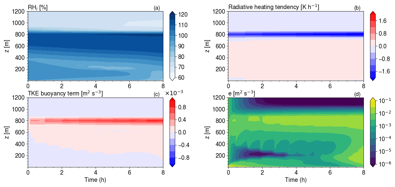 Figure 6Time height plots of the relative humidity with respect to ice (a), radiative heating tendency (b), TKE production term by buoyancy (c) and TKE (d) in the TEST LMDZ SCM simulation on the ISDAC case.