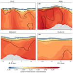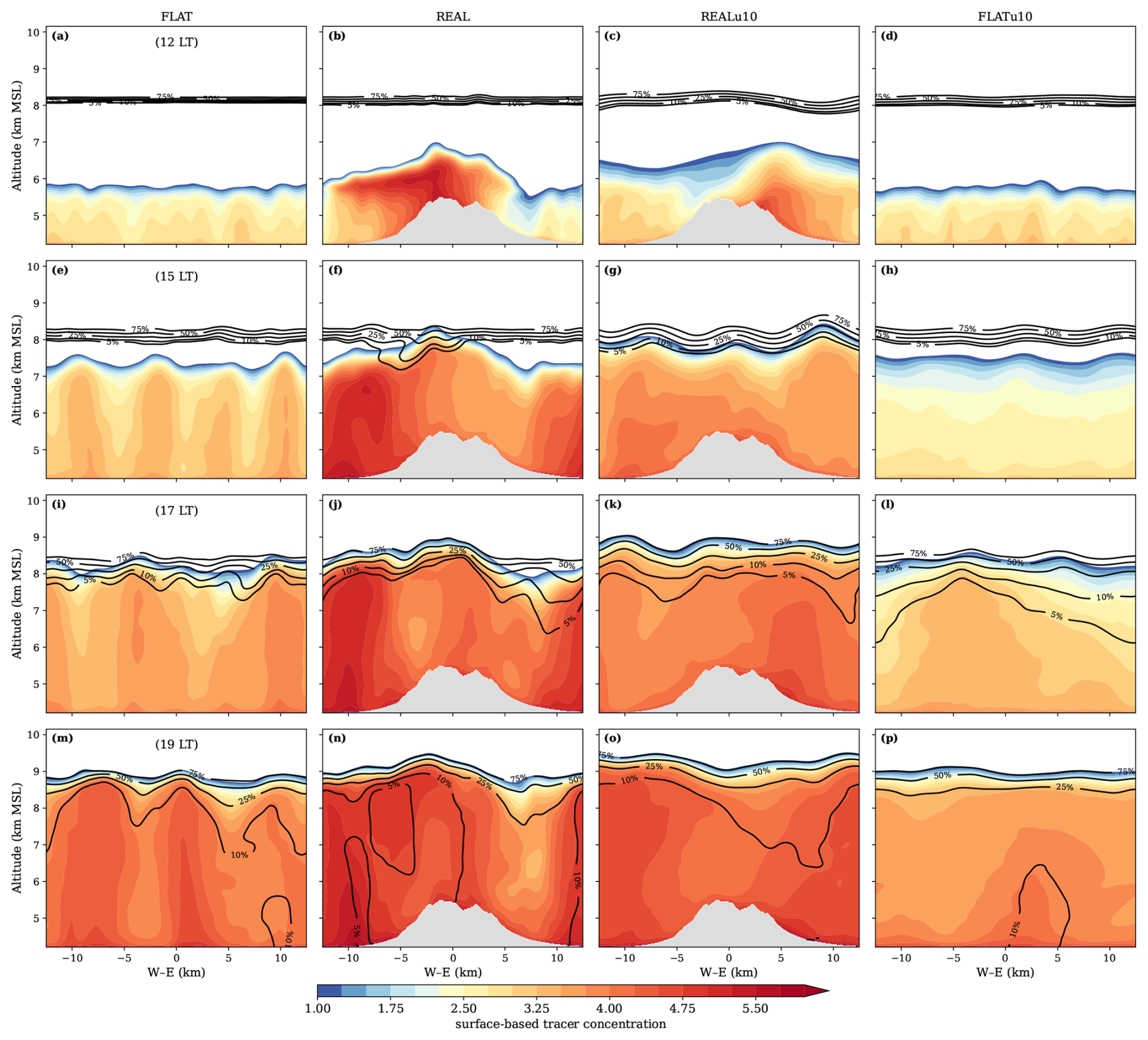 An important nuance emerging from our analysis is the distinction between ABL height above mean sea level and ABL depth above the local surface. Figure 9 shows that, although ABL heights (m MSL) increase with terrain elevation (and are highest over the ridge in REAL) the ABL depth (m AGL) actually decreases with terrain height, especially in REALu10. In other words, the CBL over the mountain is higher in absolute terms but shallower relative to the underlying terrain than over the surrounding plateau. This emphasizes that local orographic impacts on the CBL cannot be inferred from heights MSL alone; both the vertical extent above the surface and the distribution of terrain elevations within the domain matter for interpreting vertical exchange and tracer transport.