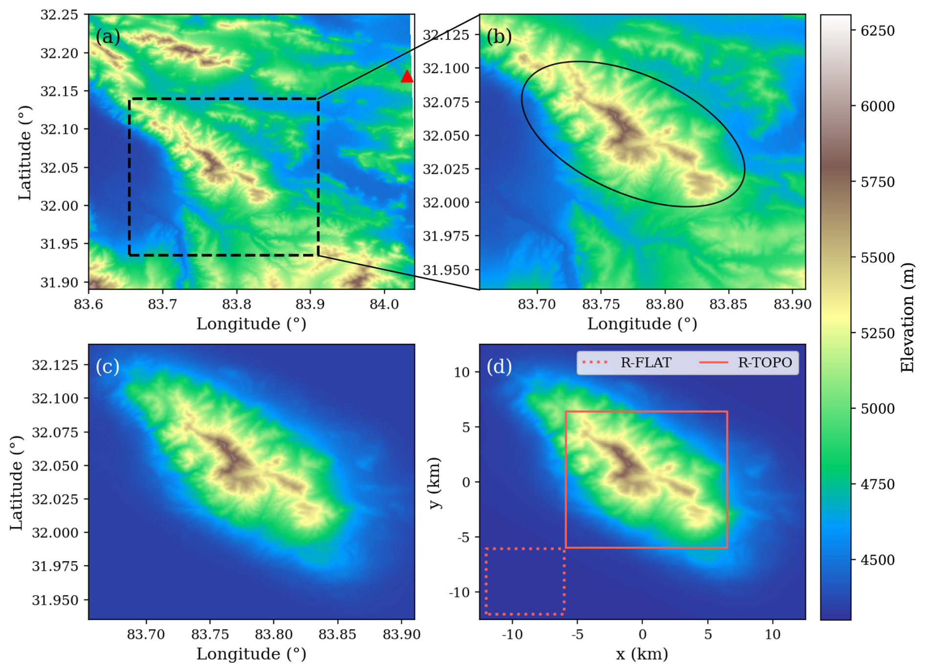 Figure 1Shaded-relief terrain elevations used in the study. (a) Broader region of the western Tibetan Plateau, with the Gerze station shown as a red triangle. (b) Zoomed view of the complex ridge–valley system. (c) Same zoomed region after applying the super-Gaussian tapering outside the ellipse to smooth the lateral boundaries. (d) Final terrain field used in the REAL simulation, obtained by applying a 2D Gaussian filter to panel (c). The locations of the R-TOPO and R-FLAT subdomains used for the statistical analysis are indicated by orange rectangles. Elevation data are based on SRTM and reprojected to a Cartesian grid.