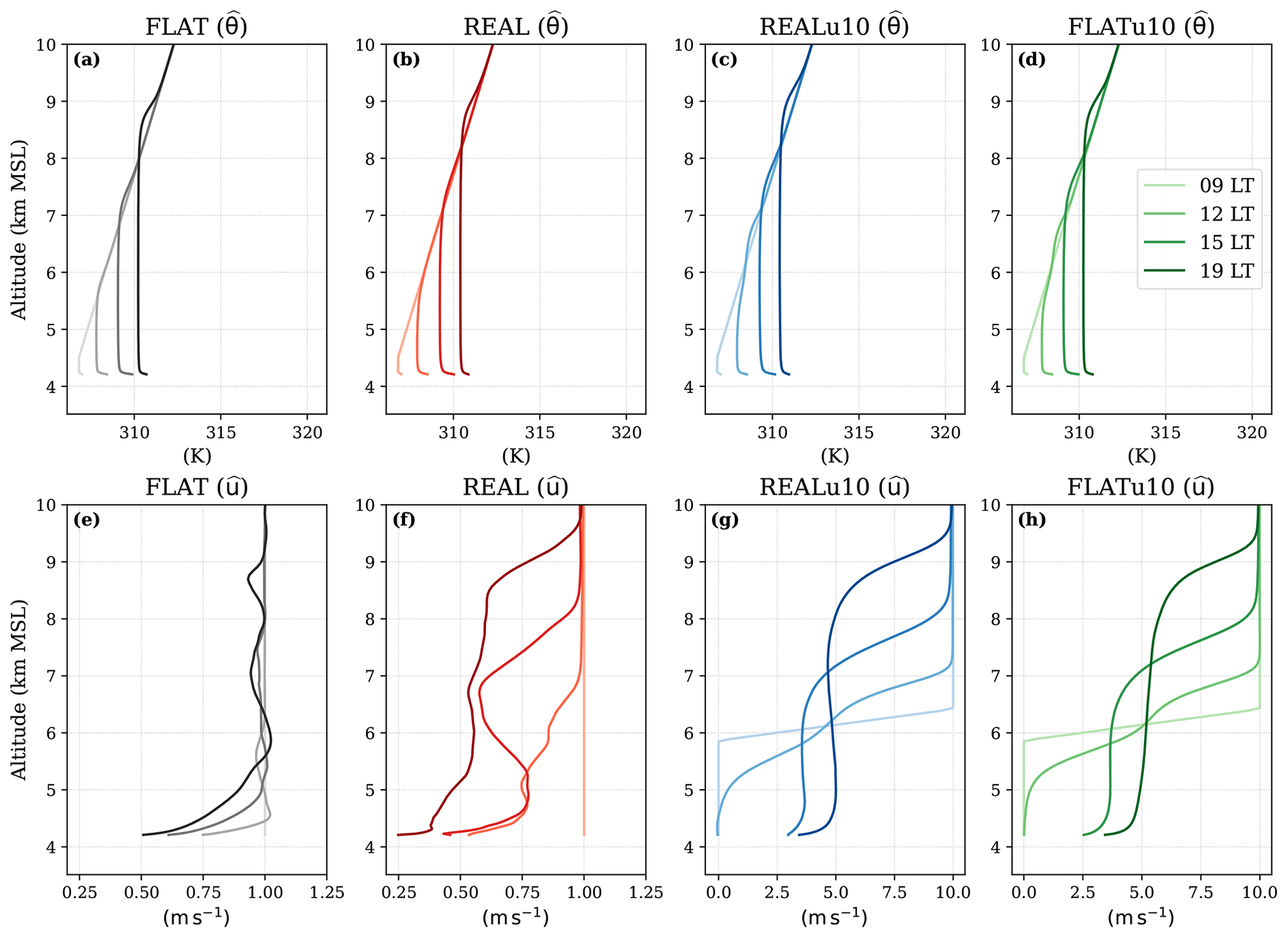 Figure 2 shows the evolution of domain-averaged potential temperature () and -wind profiles. The profile shows the atmosphere heating from the surface, with a sustained unstable surface layer, followed by a deep and growing adiabatic, but statically unstable layer. The ABL height extends up to more than 9 km a.m.s.l. at 19:00 LT for all experiments, but slightly higher in REALu10. The FLAT wind profiles remain close to the imposed background wind, except within the lowest 0.5 km where surface drag reduces the flow. In contrast, the REAL experiments exhibit more nuanced wind structures due to the combined effects of surface drag, complex orography, thermal winds, plain-to-mountain circulations, and upper-level recirculation. Nevertheless, their late-day structure becomes broadly similar. The REALu10 and FLATu10 profiles are highly comparable: they begin with strong vertical shear, but downward momentum transport gradually produces a finite mean wind throughout the boundary layer and a shear layer across the entrainment zone.