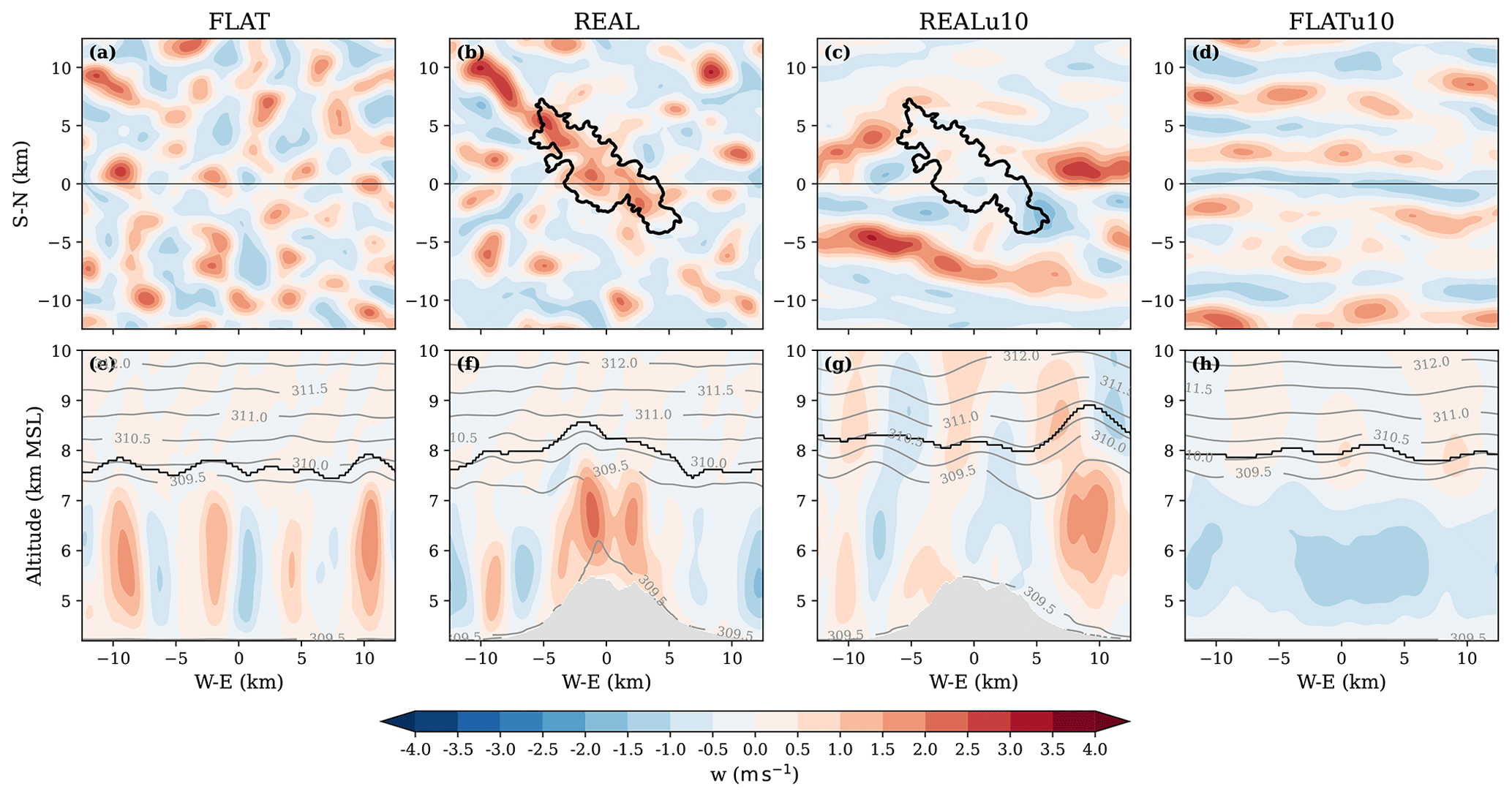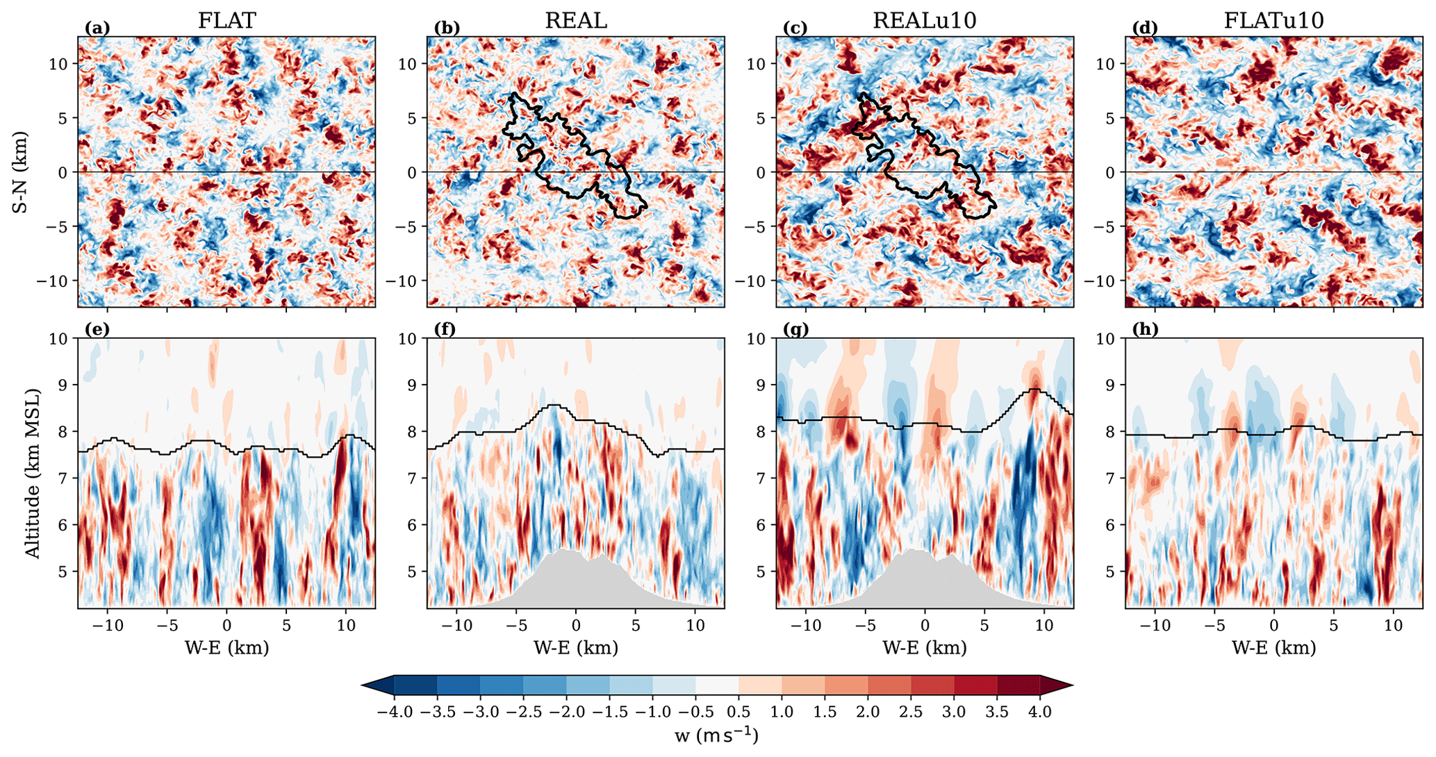 In stark contrast is FLATu10 (Fig. 3d and h), where convection results in elongated streaks in the direction of the mean wind. These streaks reflect the formation of roll-like vortices, a property of shear-dominated turbulent boundary layers. The result is a transition from isolated quasi-stationary updrafts to a more continuous, shear-aligned convection structure. In REALu10 (Fig. 3c and g), the complex orography modifies the convection layout into na orography-modulated irregular shear-aligned convection.