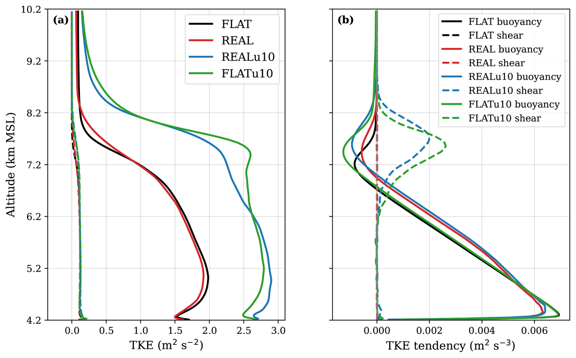 During the day, vigorous turbulence efficiently mixes heat, momentum, and scalars, producing a well-developed CBL. At midday (15:00 LT), the TKE profiles of FLAT and REAL are similar, while the shear cases (REALu10 and FLATu10) show systematically higher values throughout and above the ABL (Fig. 5a). Since all runs start from identical conditions, this enhancement is expected: the added wind shear directly contributes to turbulence shear production (Fig. 5b). An increased TKE above the ABL, particularly in REALu10, also reflects weak gravity-wave activity generated by overshooting thermals over the ridge. Such waves are a physically expected response in a deeply convective, weakly stratified environment and do not materially affect the diagnosed ABL structure. Shear also organizes turbulence into roll structures, in contrast to the isolated plumes seen in the no-shear cases (see REAL and FLAT in Fig. 6).
