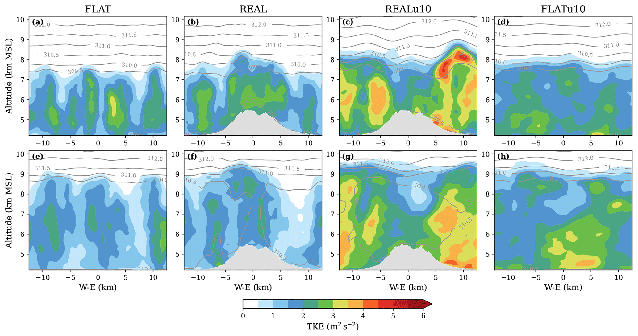 The effect of added shear (FLATu10) and terrain forcing (REALu10) further amplifies turbulence and promotes vertical TKE growth (Figs. 5a and 6c, d, g, and h). The turbulent structures are also more spatially homogeneous than in FLAT and REAL.