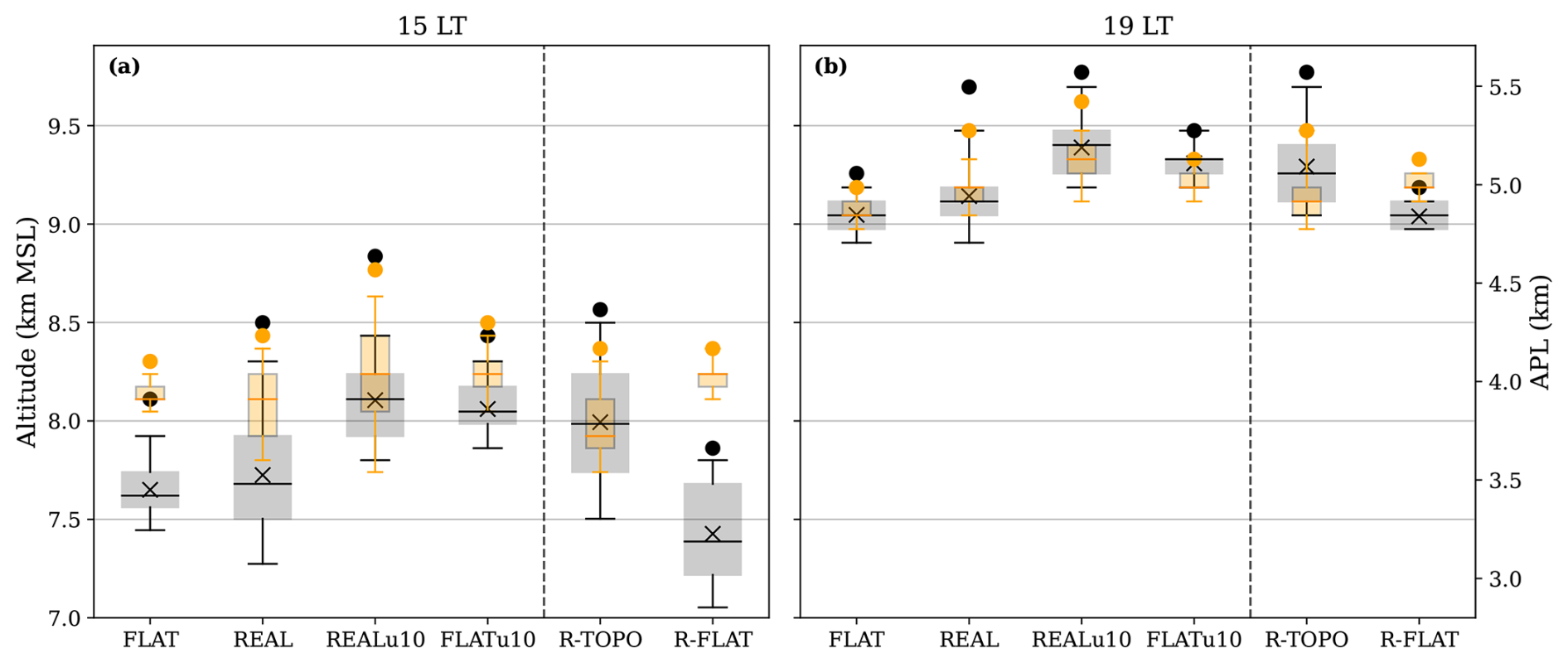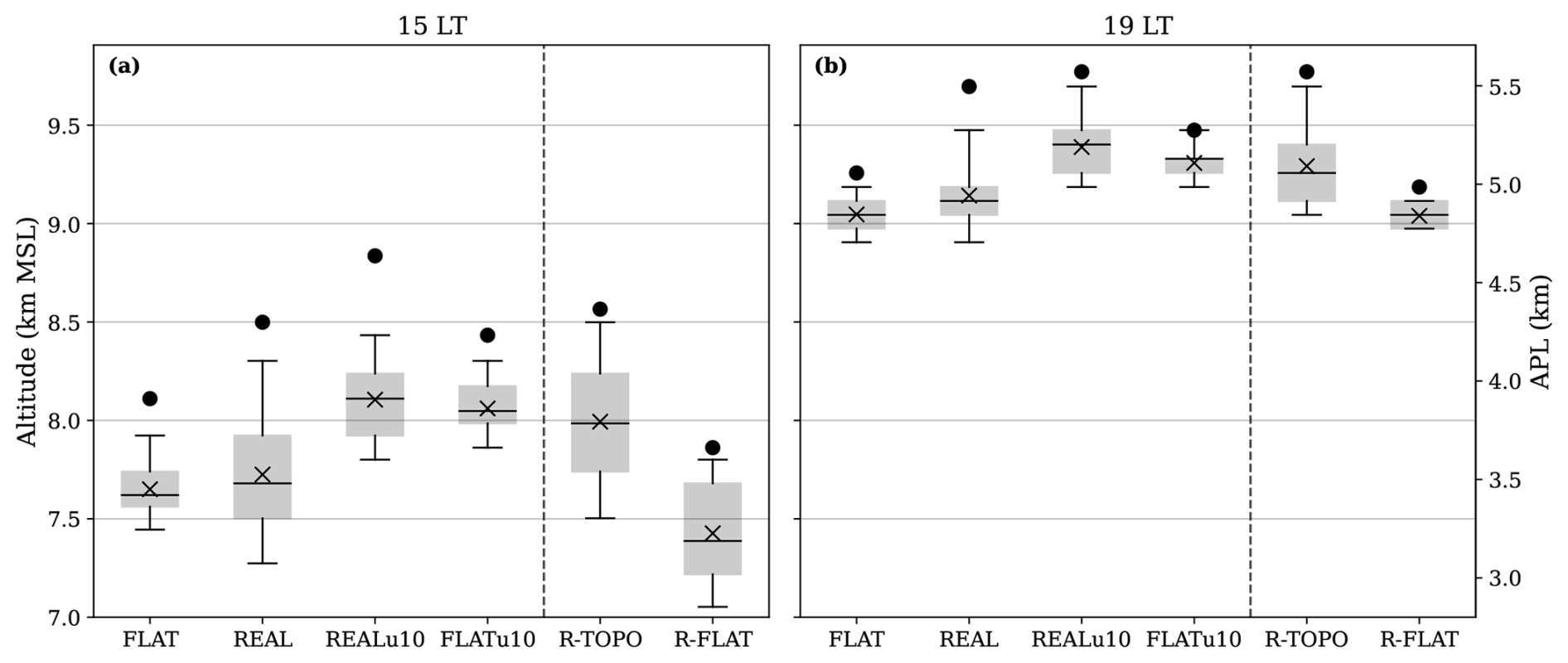 Figure 8Horizontal variability of the ABL height diagnosed from the ensemble-averaged surface-based tracer at (a) 15:00 and (b) 19:00 LT. For each experiment, box-whisker diagrams show the 25th–75th percentile range, whiskers the 5th–95th percentiles, crosses the mean, and circles the 99th percentile. Heights are shown in km m.s.l. (left axis) and in km APL (right axis). A vertical dashed line separates the four full-domain experiments from the two REAL subdomains (R-TOPO and R-FLAT).