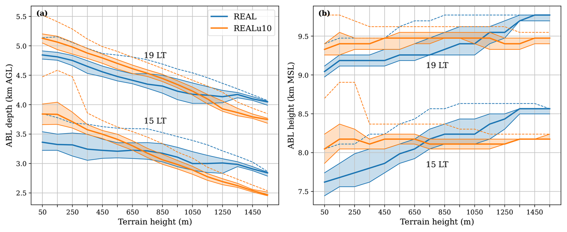 Figure 9(a) ABL depth in km a.g.l. and (b) ABL height in km m.s.l. as a function of underlying terrain elevation (m APL) for REAL and REALu10 at 15:00 and 19:00 LT. Terrain is grouped into 100 m bins. For each terrain bin, solid curves denote the median, shaded bands the 25–75th percentiles, and dashed lines the 99th percentiles.