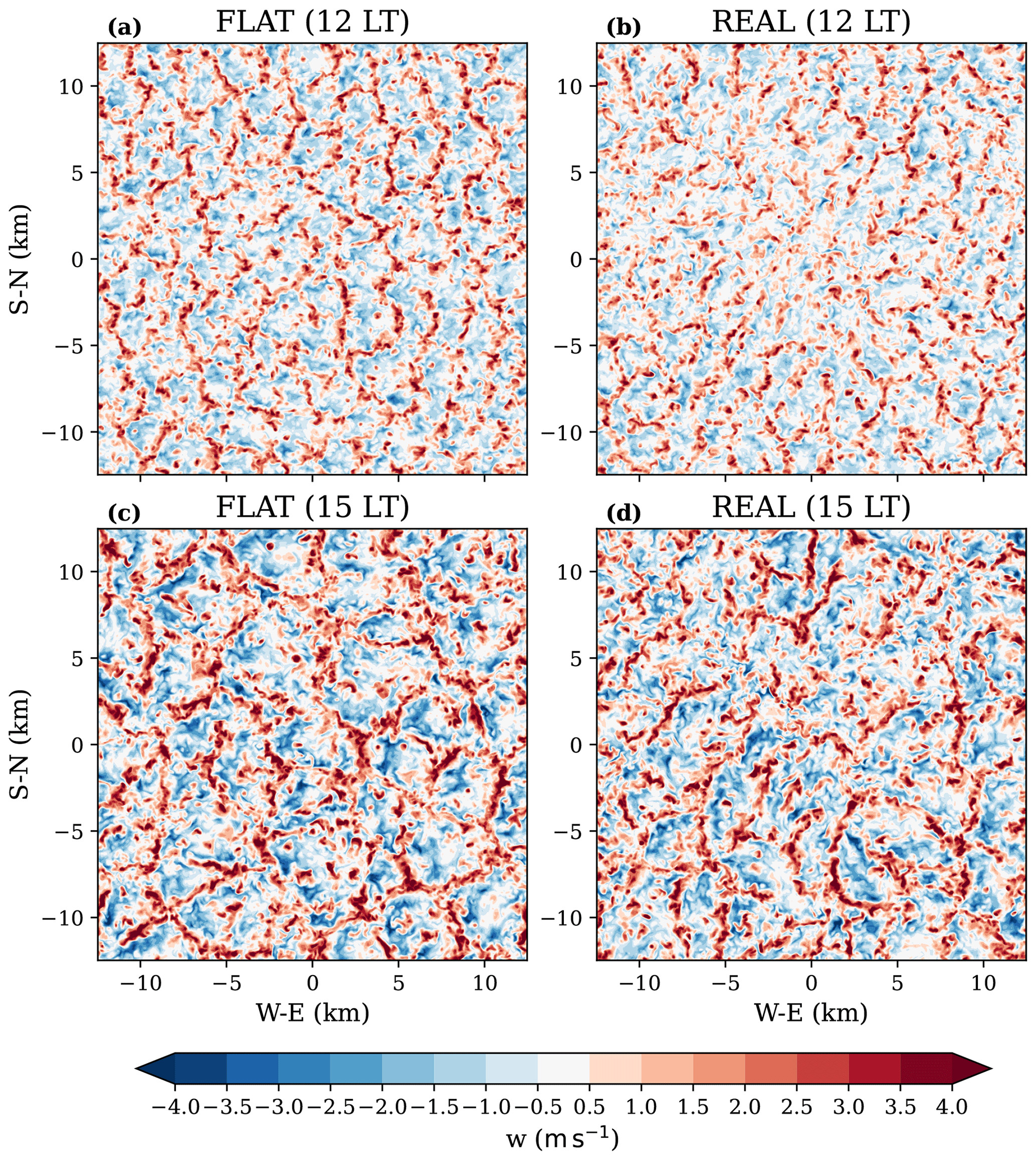 Figure C1 shows horizontal cross-sections of instantaneous vertical velocity perturbations at 500 m a.g.l. for FLAT and REAL at 12:00 and 15:00 LT. At 12:00 LT, the flow is characterized by relatively small (2 km), cellular updraft–downdraft structures typical of an early CBL (2–4 km depth). By 15:00 LT, these cells have merged into fewer, larger (5 km) structures, reflecting the growth of the convective length scale as the ABL deepens.