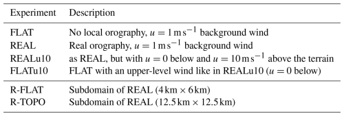 The small-scale orography contains slopes up to about 36° and characteristic ridge–valley structures typical of the central Tibetan Plateau (Fig. 1a), with elevation differences up to ∼1.4 km and ridge widths of 5–10 km. Four experiments are conducted: REAL, which uses the realistic orography; FLAT, which represents an elevated plateau at 4200 MSL without local orography; and the corresponding experiments REALu10 and FLATu10, which include an imposed large-scale background wind. In REALu10 and FLATu10, the horizontal wind speed increases linearly above the mountain crest, reaching , in order to introduce a non-zero plateau-scale flow comparable to that reported by Chen et al. (2016, their Fig. 5), while keeping near-surface winds weak to avoid triggering strong orographic waves during initialization. The base elevation in FLAT and along the smoothed edges of REAL and REALu10 corresponds to the minimum elevation within the realistic terrain (Fig. 1a). The full list of experiments and their descriptions is provided in Table 1.