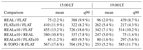 The upper tail of the ABL height distribution (99th percentile in Fig. 8) reveals a much stronger orographic imprint. At the domain scale, REAL exceeds FLAT by about 10 % at 15:00 and 19:00 LT in the 99th percentile, whereas the shear-induced increases (FLATu10–FLAT; REALu10–REAL) are smaller, especially at 19:00 LT. The strongest orographic impact, however, appears in the REAL subdomains: at 15:00 LT the R-TOPO mean ABL height exceeds R-FLAT by about 18 %, and the 99th percentile is almost 20 % higher. By 19:00 LT, the differences decrease but remain distinct (5 % for mean; nearly 12 % for 99th percentile). Thus, while domain-mean metrics are dominated by shear, small-scale orography substantially amplifies the deepest convective columns, especially over the mountain, with implications for upper-level tracer exchange. These quantitative values are summarized in Table 2.