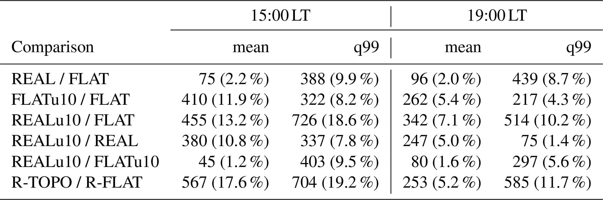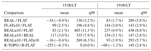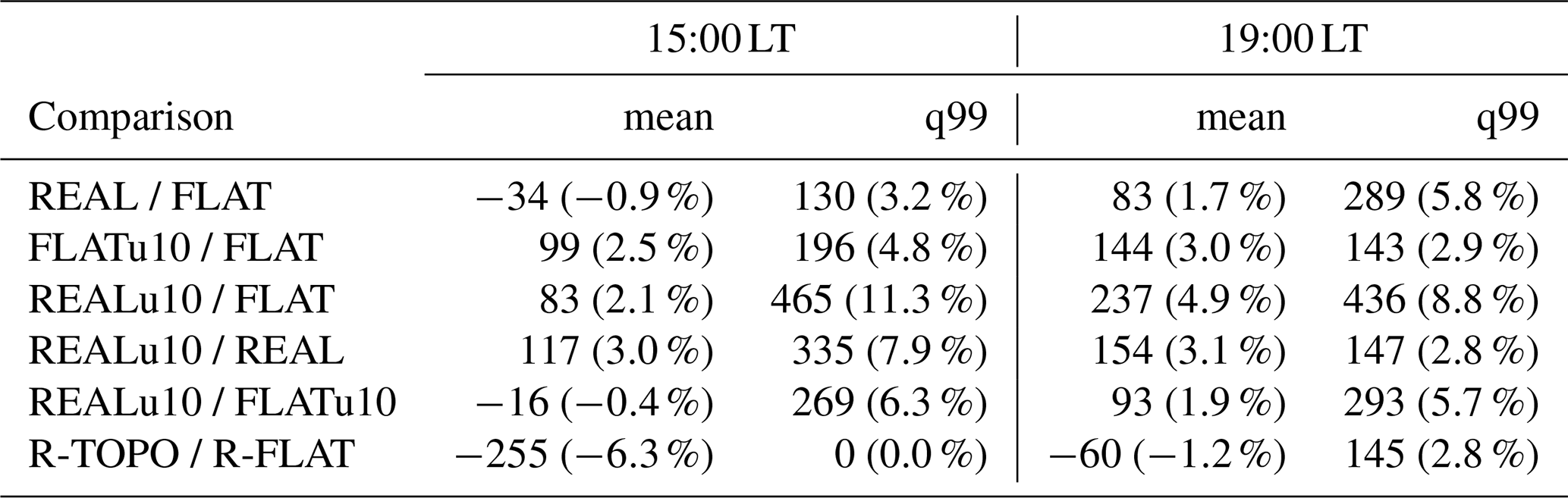 Table 2Differences in diagnosed ABL height between experiments at 15:00 LT and 19:00 LT. Values denote the difference in metres APL, and the relative difference in percent (relative to the lower experiment in each pair) in parentheses. Columns labelled “mean” refer to domain-mean ABL height; columns labelled “q99” refer to the 99th percentile.