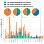 Figure 10Temporal variation of WSPyC concentration divided by each PMF factor. The pie charts show the average seasonal contribution of each PMF factor to WSPyC concentration.