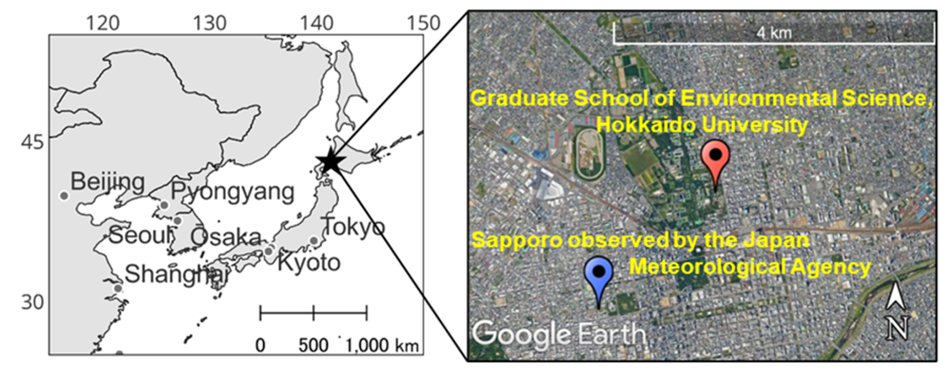 Hourly wind direction and wind speed data at Sapporo observed by the Japan Meteorological Agency (43.06° N, 141.328° E, Fig. 1) were obtained from the Japan Meteorological Agency website (https://www.data.jma.go.jp/stats/etrn/index.php, last access: 8 February 2026). The wind rose plots were produced using R with the “Climatol” package. Monthly precipitation data in Sapporo were also obtained from the Japan Meteorological Agency's website.