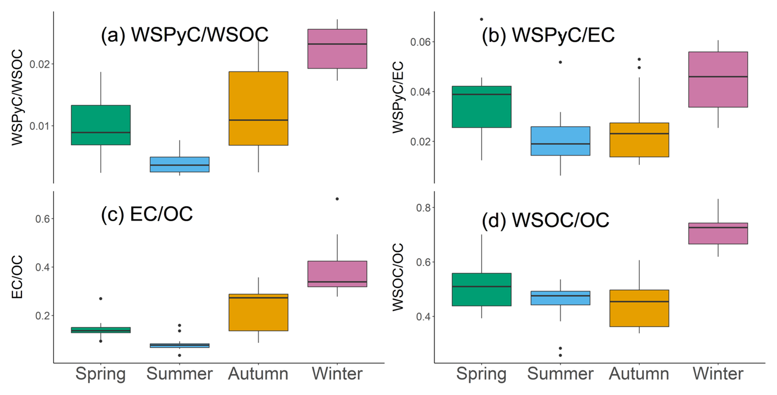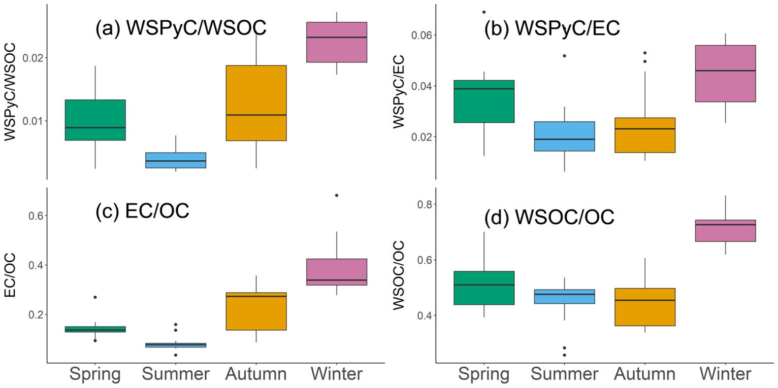 WSPyC WSOC and WSPyC EC ratios have been reported to increase under the influence of biomass burning, because biomass burning occurs at relatively low temperatures, it tends to promote the formation of less-condensed aromatic structures, such as WSPyC, compared to EC (Geng et al., 2021). WSPyC WSOC ratio was 0.002–0.027 (mean: 0.012±0.01). The mean value of WSPyC WSOC in winter was 0.023±0.003 and was significantly higher (p<0.05) than in autumn (0.013±0.007), spring (0.010±0.005), and summer (0.004±0.003), in that order (Figs. 3a and S4a). WSPyC EC ratio was observed with a range from 0.0063 to 0.069 (mean: 0.033±0.017). The seasonal mean in winter (mean: 0.044±0.013) was significantly higher (p<0.05) than in autumn (mean: 0.026±0.014) and summer (mean: 0.024±0.016), and roughly twice the summer value (Figs. 3b and S4b).