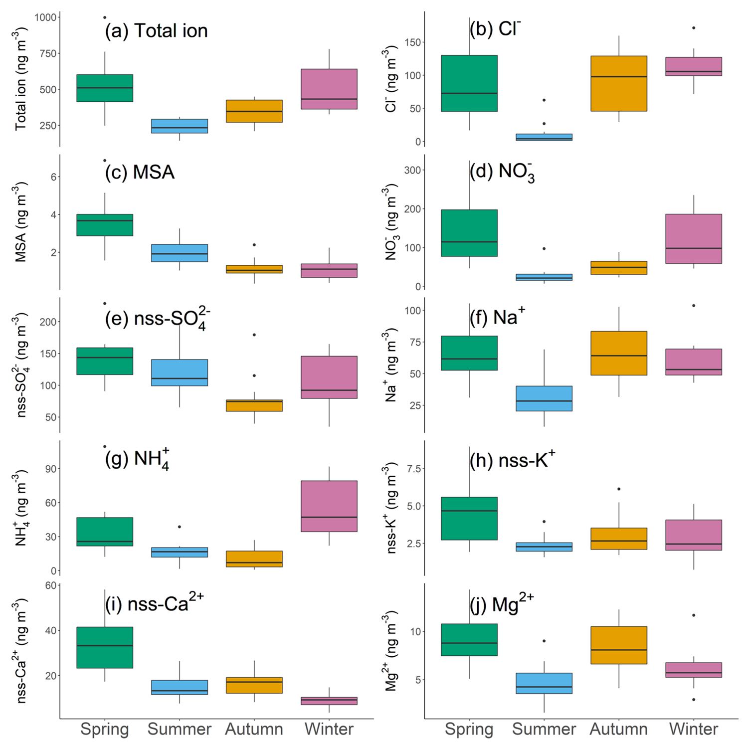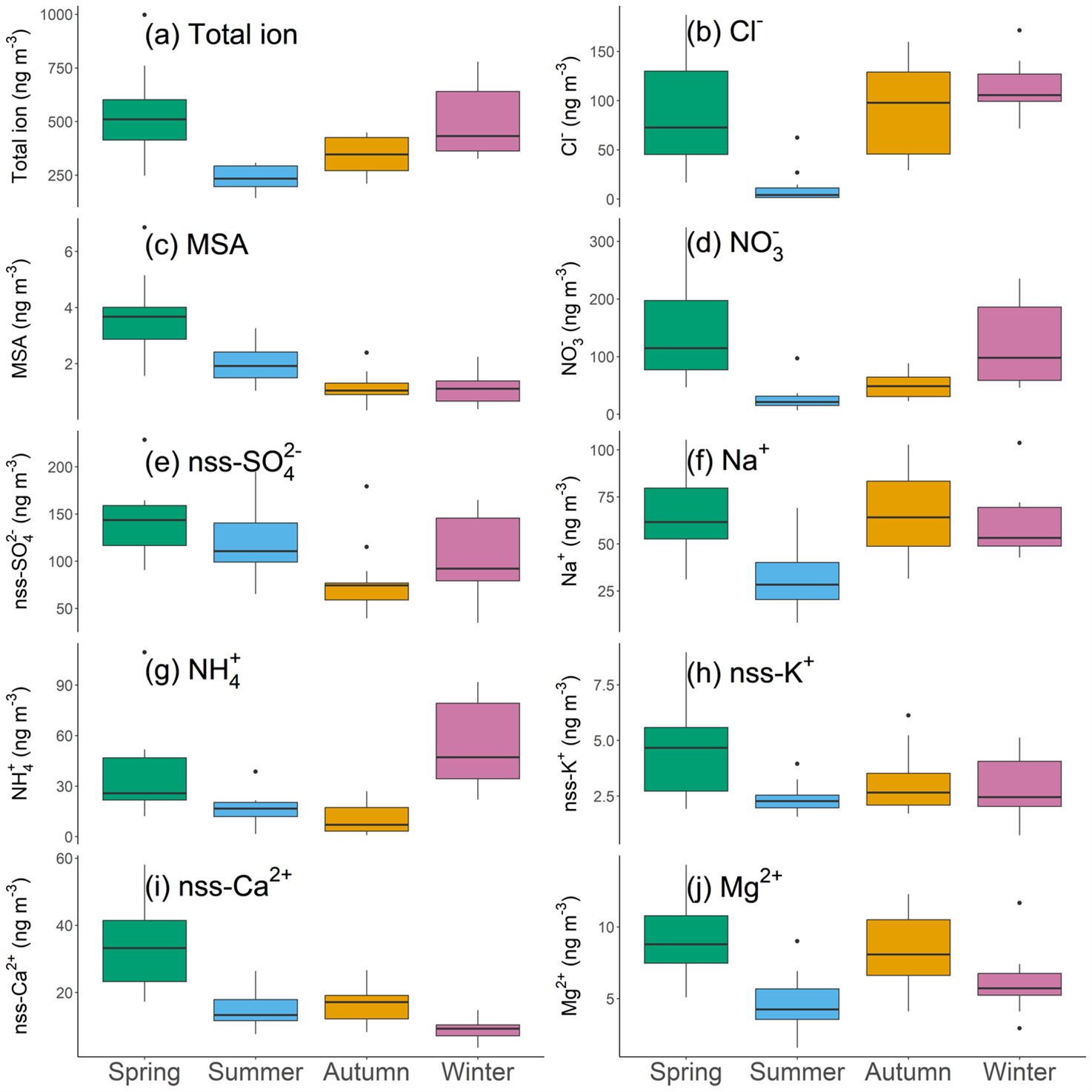 Inorganic ions and MSA concentrations are used to assess the source of aerosols. Figure 4 shows the seasonal trends of inorganic ions and MSA concentrations observed in Sapporo as box-and-whisker plots. Figure S5 presents temporal variations. In spring, the highest concentrations were observed for total ions, MSA, NO, nss-SO, nss-Ca2+, and nss-K+, and their seasonal mean concentrations were also the highest (excluding the dust sample). During the dust event, the highest concentrations were observed for Cl−, MSA, Na+, nss-K+, nss-Ca2+, and Mg2+ (Fig. S5). In summer, the mean concentrations of total ions and many individual ion species (Cl−, NO, nss-K+) were at their lowest. In contrast, mean concentrations of MSA and nss-SO in summer were higher than in autumn and winter. In autumn, no ion species showed particularly high concentrations. In winter, mean concentrations of total ions and NO were higher than in summer and autumn and were similar to those in spring. Furthermore, NH in winter showed the highest mean concentration. The mean concentration of nss-Ca2+ in winter was significantly lower than in other seasons.