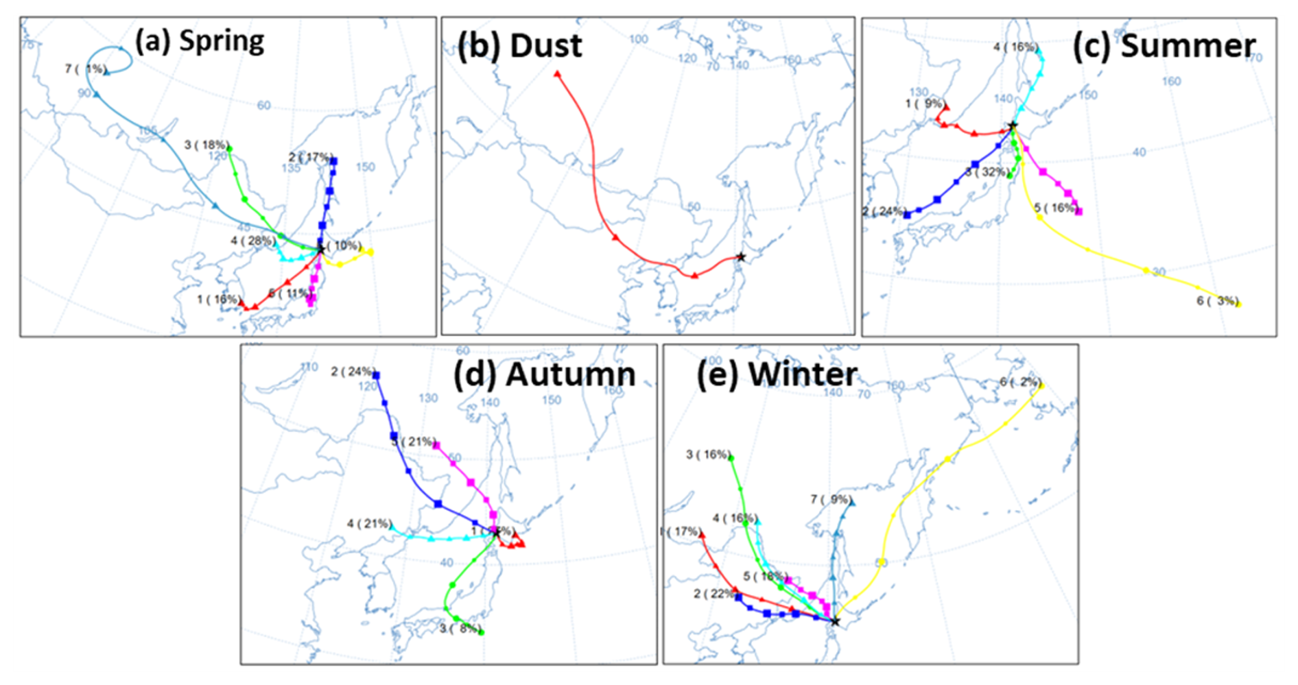 Wind direction, wind speed, and backward trajectories can help estimate the potential origin of the aerosols. Northwesterly and southeasterly winds were dominant in Sapporo throughout the observation period. In spring, the observed frequency of northwesterly and southeasterly winds was similar, while the northwesterly winds tended to have higher speeds than those of southeasterly winds (Fig. S6a). The air mass back trajectories showed that about half of the air masses came to Sapporo from the west (continental side) in spring (Fig. 5a). The Asian dust (yellow dust) event was observed during 12–13 April 2023 (Fig. 5b). In summer, southeasterly winds were dominant (Fig. S6c), and the back trajectories showed that air masses were often transported from the adjacent seas (Fig. 5c). The southeast winds were also dominant in autumn (Fig. S6d). The back trajectories showed that 66 % of the air masses in autumn were transported from the Eurasian continent (Fig. 5d). In winter, northwesterly winds with speeds exceeding 4 m s−1 were dominant (Fig. S6e), and the back trajectory also showed that most of the air masses came from the continent (Fig. 5e).