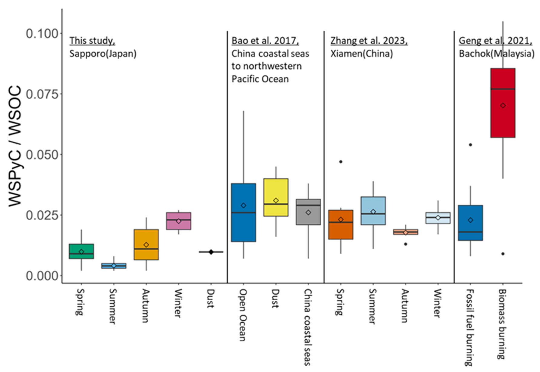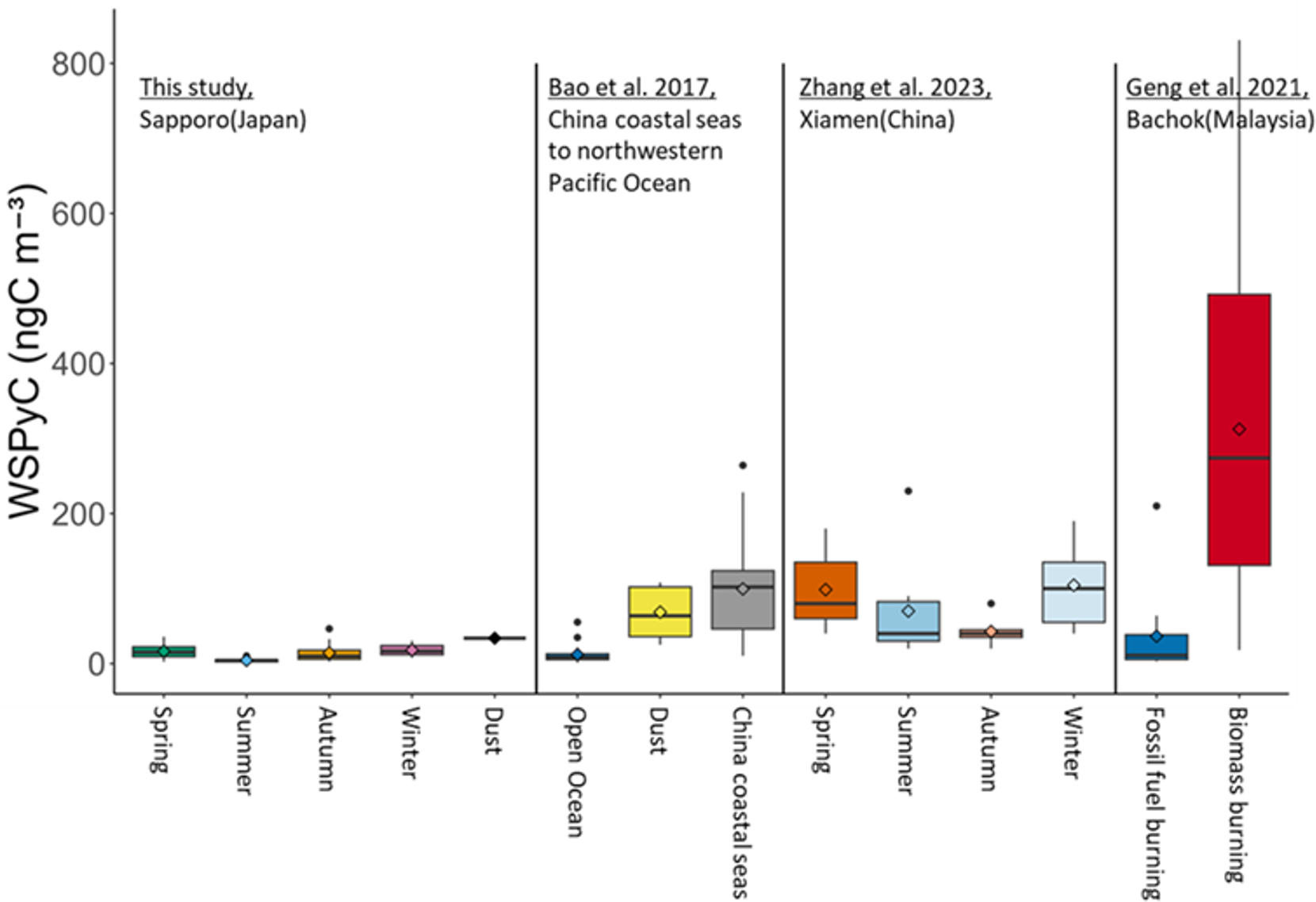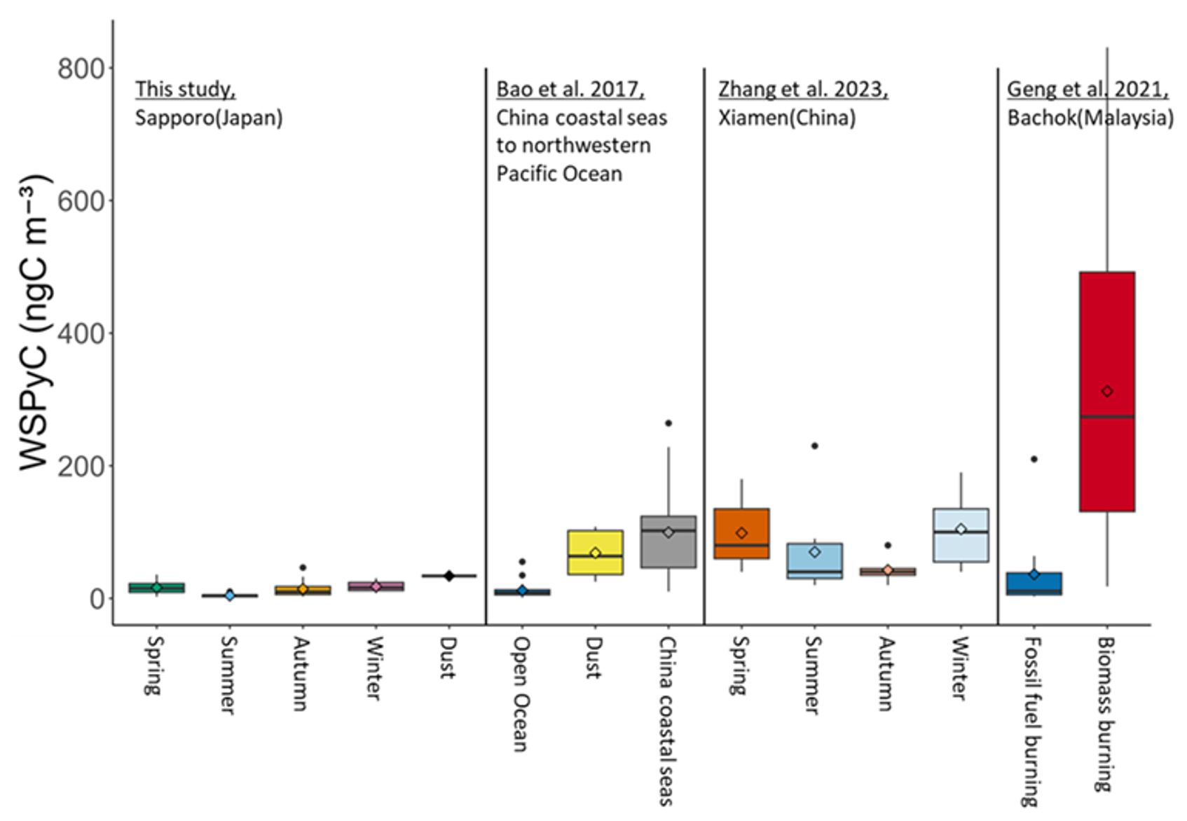 The concentrations of WSPyC in atmospheric aerosol observed in Sapporo varied seasonally, with lower concentrations in summer and no significant differences in other seasons (Fig. 2a). The concentrations of WSPyC observed in this study were similar to those observed in the open ocean of the western North Pacific Ocean (Bao et al., 2017). On the other hand, the observed concentrations were lower than those observed in Bachok, Malaysia (Geng et al., 2021), Xiamen, China (Zhang et al., 2023a), the China coastal seas (Bao et al., 2017), and the Asian dust samples collected in the western North Pacific Ocean (Bao et al., 2017). The concentration of WSPyC in the dust sample collected in this study was approximately at the first quartile of the Asian dust samples collected in the western North Pacific Ocean (Bao et al., 2017) (Fig. 6). The comparison with previous studies suggests that the local emission of WSPyC around the study region (Sapporo, Japan) was relatively low compared to the earlier studies in China and Malaysia.