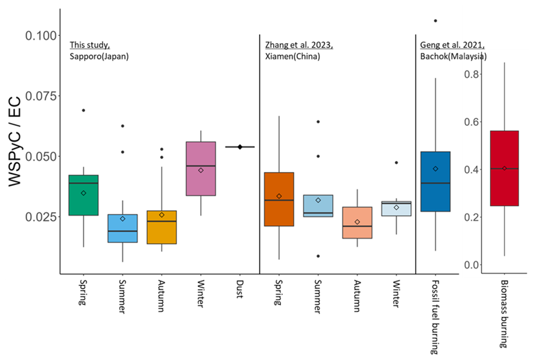 Figure 8Comparison of the WSPyC EC ratio of aerosols collected in Sapporo with that of previous studies. The y axis scale for biomass burning (Bachok, Malaysia) differed from the others.
