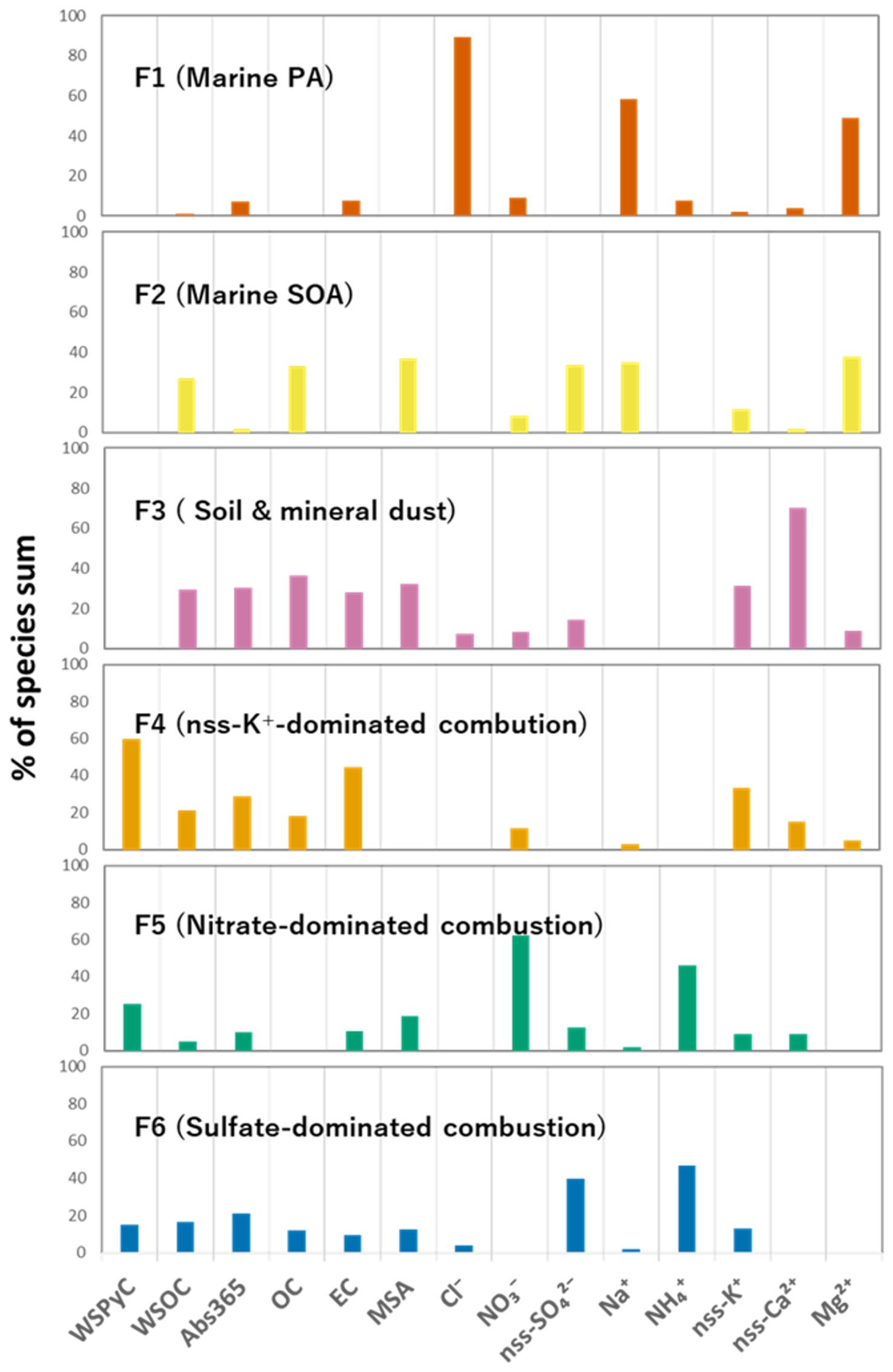 A PMF analysis resolved six interpretable factors contributing to the observed WSPyC concentration (Fig. 9). F1 was characterized by substantial contributions of Cl−, Na+, and Mg2+ (>48 %), indicating a marine primary origin and defined as “marine PA”. F2 was dominated by MSA, nss-SO, OC, and WSOC (>27 %), which was defined as “marine secondary organic aerosols (SOA)”. F3, with a large contribution of nss-Ca2+ (70 %), was defined as “soil and mineral dust”. F4 was attributable to WSOC, Abs365, nss-K+, and EC (21 %–44 %). Because nss-K+ is known to originate from biomass and biofuel burning (Chow et al., 2004; Pant and Harrison, 2012), F4 is defined as “potassium-dominated combustion” sources primarily influenced by biomass and biofuel burning. F5 showed the largest contribution of NO (62 %), followed by NH (46 %), and defined as “nitrate-dominated combustion” source. F6 was dominated by nss-SO and NH (>40 %) with minor contributions of WSOC and Abs365 (15 %–21 %), which is defined as “sulfate-dominated combustion” source. NOx is precursor gas species of NO, which is emitted from various anthropogenic combustion activities, such as mobile sources (e.g., traffic and ships) being particularly prominent (Geng et al., 2024; Ni et al., 2024). SO2 is precursor gas species of SO, which primarily originates from coal combustion in factories and power plants (Lin et al., 2022). Therefore, F5 and F6 indicate the aerosols associated with combustion sources that had undergone atmospheric ageing processes.