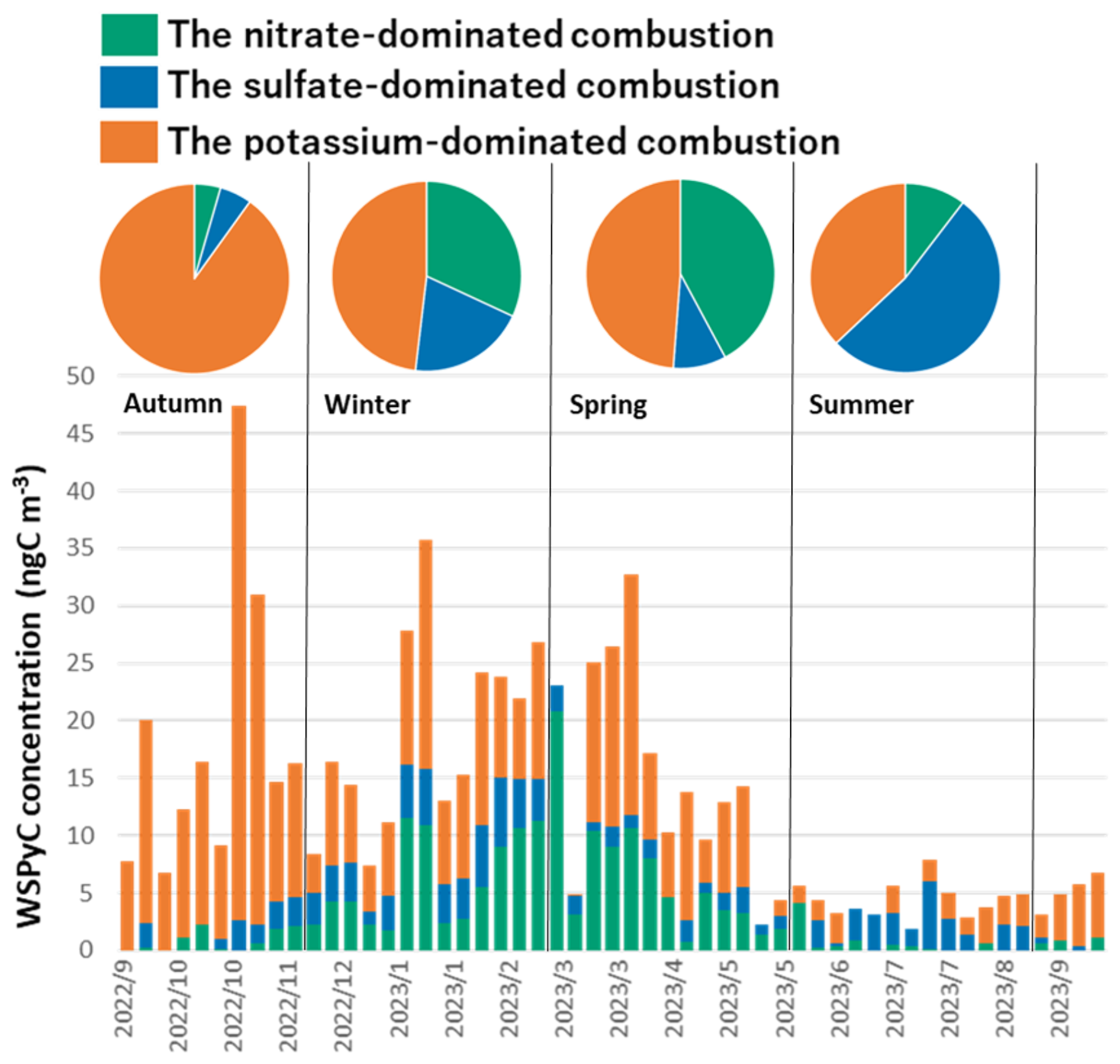 It should be noted that the observed WSPyC concentrations were controlled by only three factors (i.e., F4, F5, and F6), all attributed to combustion-related factors, confirming the combustion origin of the WSPyC. The observed WSPyC in Sapporo was 60 % from potassium-dominated combustion sources (F4), 25 % from nitrate-dominated combustion (F5), and 15 % from sulfate-dominated combustion (F6), demonstrating that biomass burning and secondary aerosols from fossil fuel combustion are the primary sources of WSPyC in Sapporo. Figure 10 illustrates how the contribution of each factor to the WSPyC concentration varies over time, as well as showing the seasonal mean. The potassium-dominated combustion sources were the dominant factor controlling the WSPyC concentration in autumn in Sapporo. The highest concentration of WSPyC observed in this study was in autumn. It was associated with the highest concentration of WSPyC with the potassium-dominated combustion sources (Fig. 10). Back trajectory analysis of the sample with the highest WSPyC concentration (8 November 2022, in Fig. S2) revealed a strong influence of the continental air masses. The combined contribution of the nitrate- and sulfate-dominated combustion sources was about half of the WSPyC concentration in spring and winter, indicating a greater contribution of WSPyC derived from aged fossil fuel combustion aerosols compared to autumn. The larger contribution of sulfate-dominated combustion sources in winter compared to spring may be influenced by coal use for heating in Northeast China because it has been reported that the leading cause of winter smog in Northeast China is the use of coal for residential heating (Zhang et al., 2020). The back trajectories in winter show a strong continental origin (Fig. 5e), suggesting that they may more closely reflect combustion activities on the continent.