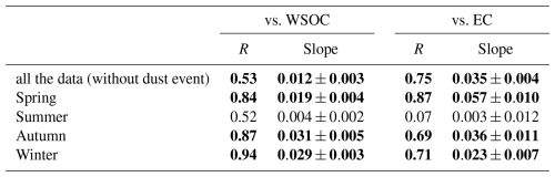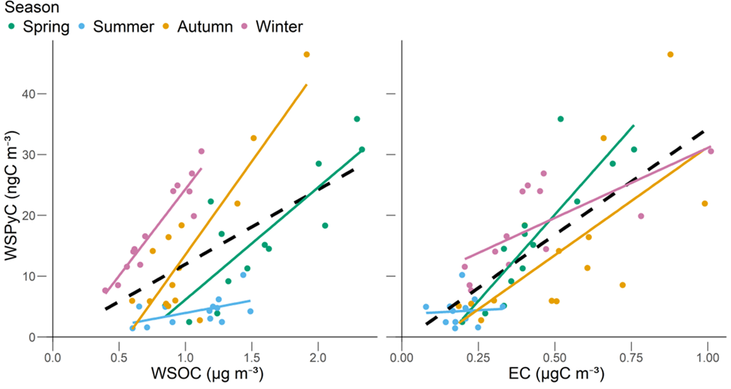 Figure 11Linear regression analyses between concentrations of WSPyC and WSOC, EC. The black dashed line represents the linear regression for all samples, excluding the dust samples. The colored lines represent the linear regression for each season.