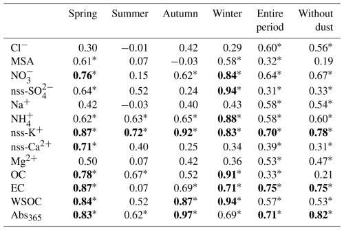 The WSPyC concentration in spring also showed a strong correlation with nss-Ca2+. The nss-Ca2+ is widely used as a tracer of soil particles (Nakamura et al., 2020), and nss-Ca2+ in the Asian dust sample was remarkably highest among the samples in this study (Fig. S5i). The strong correlation between WSPyC and nss-Ca2+ in spring suggests that the prevailing westerly winds likely transport soil particles and combustion-derived WSPyC from the continent. Bao et al. (2017) measured WSPyC concentrations in aerosol samples collected in the open ocean of the western North Pacific and reported that the concentrations were higher in aerosols affected by Asian dust storms, the result of which is similar to that in the current study.