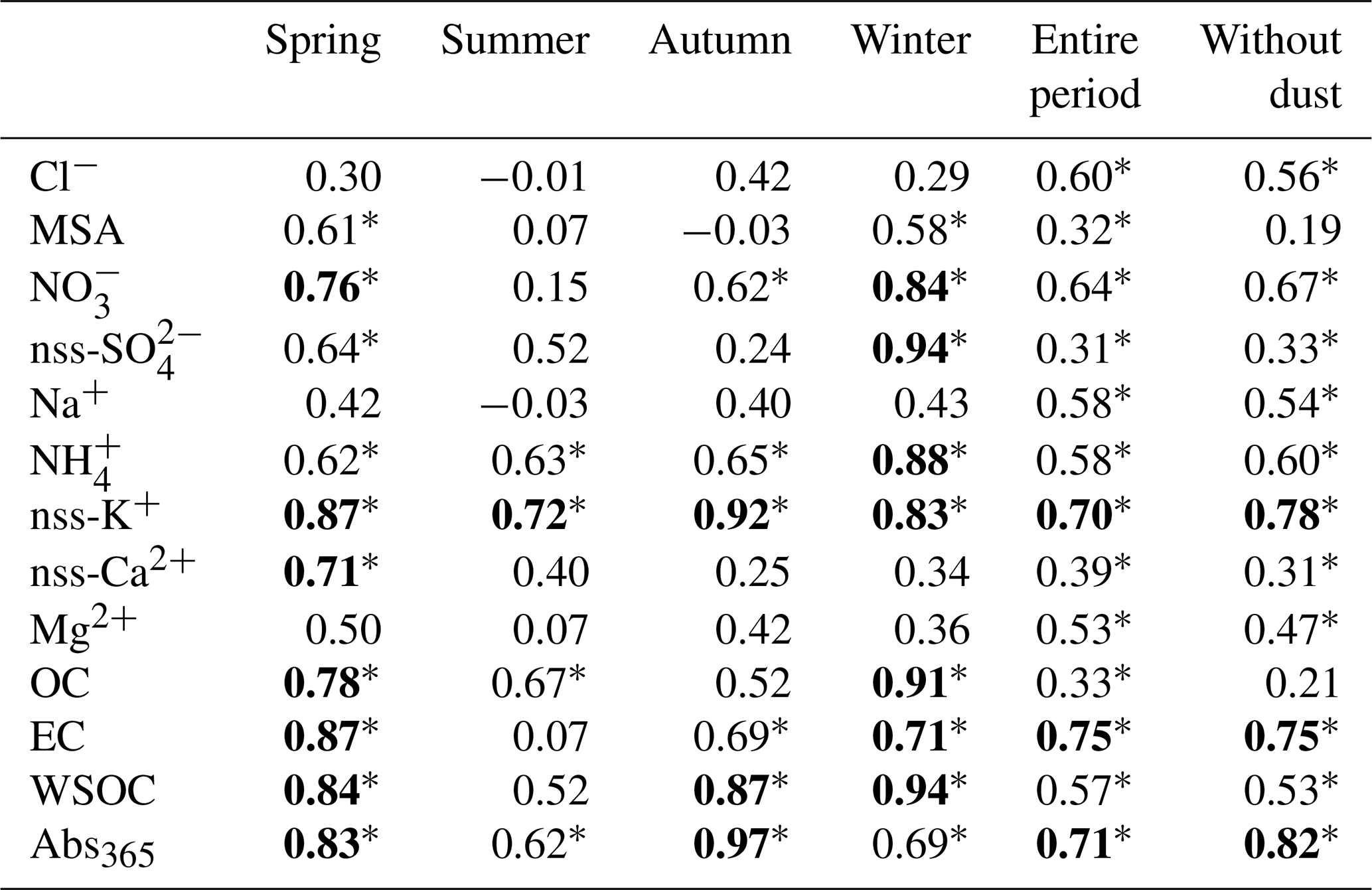 Sodium is assumed to originate entirely from sea salt, and the non-sea-salt (nss) ion concentrations (ng m−3) are determined using Eq. (3) based on the average seawater composition (Frank et al., 2008).