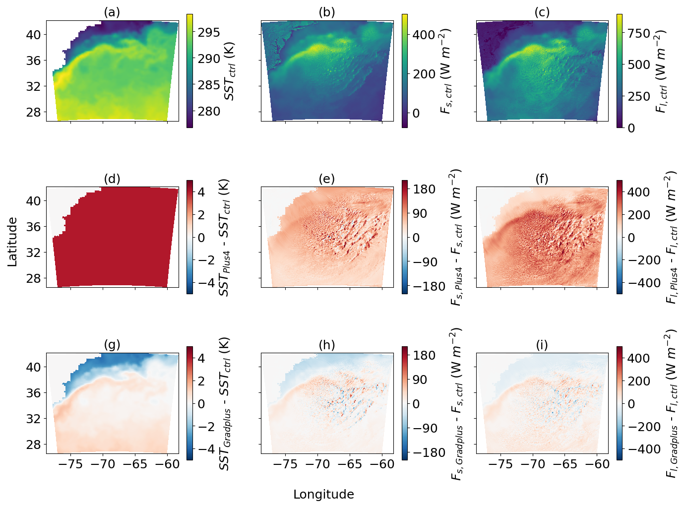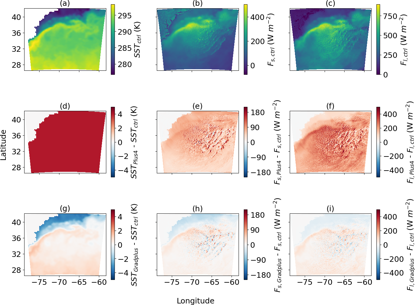 Figure 1(a) SST, (b) surface sensible heat flux, and (c) surface latent heat flux from the control simulation of out domain at 09:00 EST. Differences of (d) SST, (e) surface sensible heat flux, and (f) surface latent heat flux between the Plus4 and Ctrl simulations. Differences of (g) SST, (h) sensible heat flux, and (i) latent heat flux between the Gradplus and Ctrl simulations at 09:00 EST on 1 March 2020.