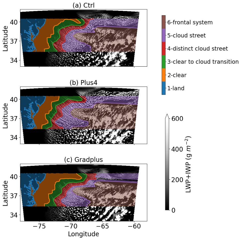 In the above context, this study focuses on three scientific questions: (1) How does an increase in mean SST (e.g., +4 K, global warming) and an enhanced SST gradient (i.e., induced by enhanced GS strength) individually modify the PFC liquid water path (LWP), cloud fraction, and phase partitioning over the GS? (2) What are the dominant mechanisms – boundary layer turbulence, large-scale ascent, or microphysical feedbacks – mediating these PFC responses? and (3) Do airmass sources shift under the altered GS conditions?