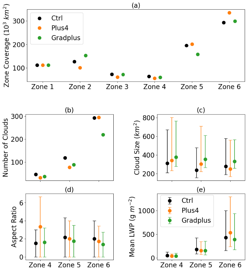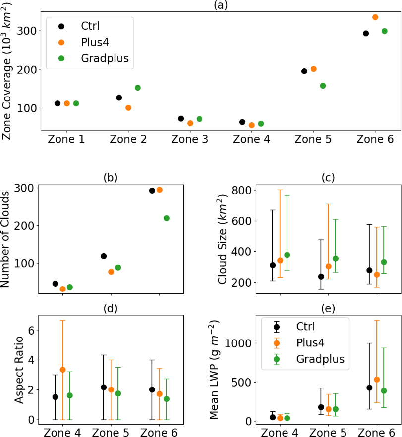 Figure 3b–e illustrates changes in cloud object size under the altered SST patterns. Cloud objects are defined here as regions where the ratio of LWP to smoothed LWP exceeds 0.8 (Chen et al., 2022). In the Plus4 experiment, PFCs exhibit a reduced number of cloud objects but a larger cloud size, while frontal clouds show minimal changes of cloud number despite a reduced cloud size. The aspect ratio in Fig. 3d, which quantifies cloud street elongation, increases by 122.2 % in Zone 4 (distinct cloud streets) indicating enhanced longitudinal organization of cloud streets in Zone 4. Mean LWP decreases by 26.0 % in Zone 4 and 15.5 % in Zone 5 but rises sharply by 24.4 % in Zone 6, reflecting more vigorous frontal clouds. These results suggest that warmer SSTs promote fewer but larger PFCs with elongated cloud streets in Zone 4, while frontal clouds become vertically deeper (evidenced by LWP increases) despite reduced horizontal extents.