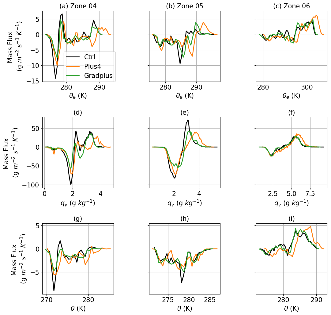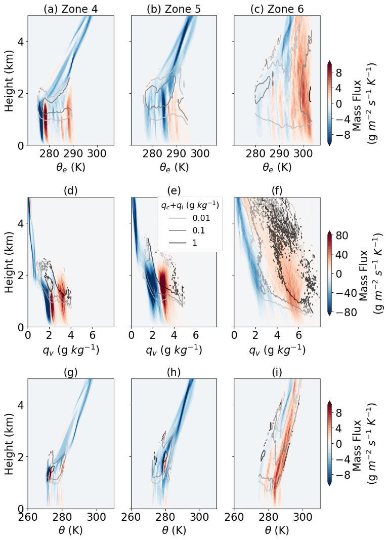 This section explores the mass and energy transport in frontal systems and PFCs. Previous studies have relied on isentropic analysis of moist convection to identify energy transport through diabatic processes, such as convection (Chen et al., 2023; Pauluis and Mrowiec, 2013). This method involves averaging the mass flux and other examined variables at the isopleths of equivalent potential temperature (θe) to isolate upward and downward motions that contribute to energy transport through their net effects. In other words, adiabatic vertical motions with oscillations (such as gravity waves) are filtered out by this averaging to derive irreversible energy/mass fluxes. Here, we apply the same method to Zones 4–6 in Fig. 4a–c to illustrate energy transport in these regions. We also show the mass flux at the isopleths of qv (Fig. 4d–f) and θ (Fig. 4g–i) to describe the properties of the air parcels.