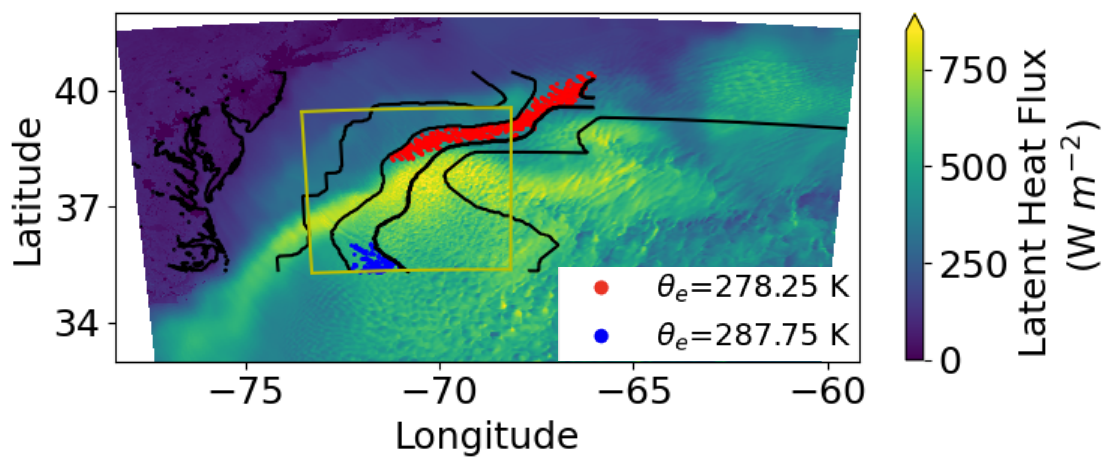 Figure 5Spatial distribution of latent heat flux. Black contour denotes the zone classification in Fig. 2. Yellow box denotes the inner domain. Red and blue dots mark the location of the two θe peaks in Fig. 4a at 09:00 EST on 1 March 2020.
