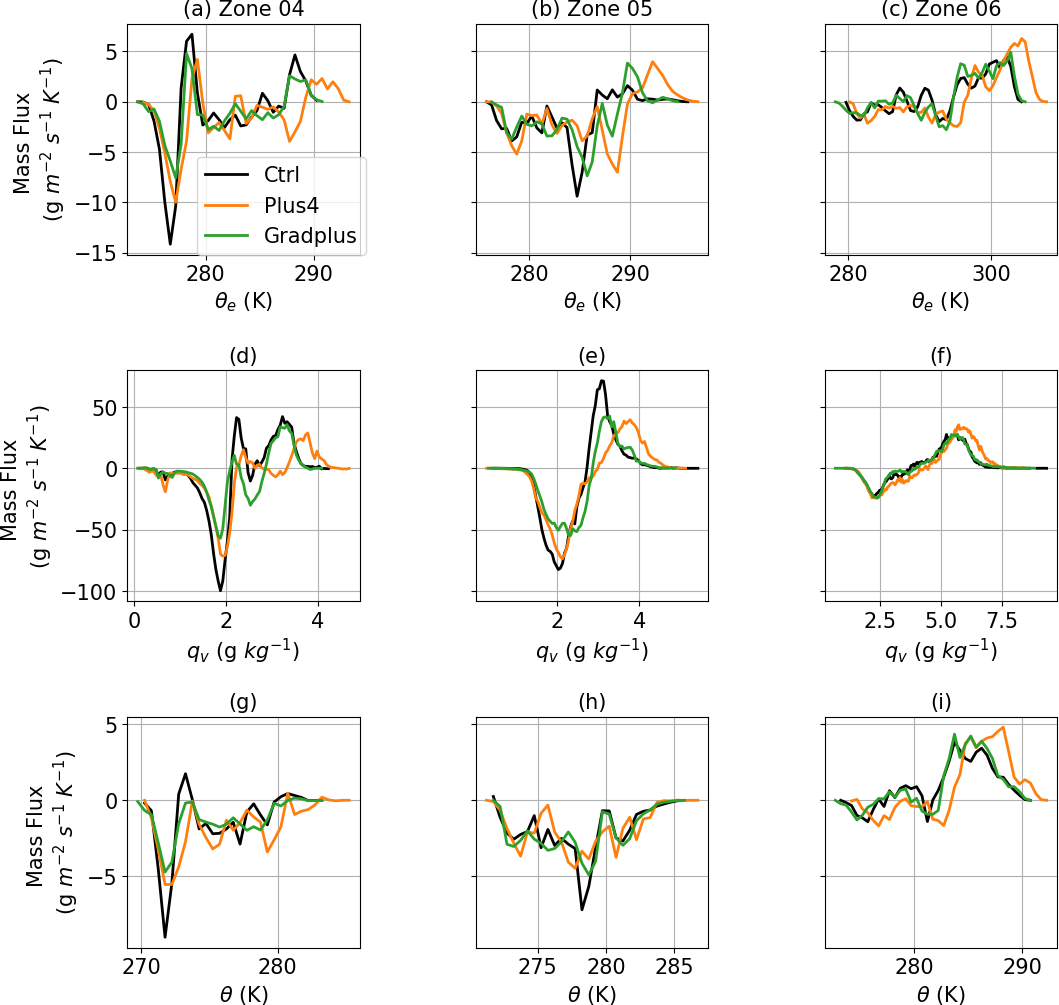 In Fig. 6, we explore the impacts of SST variations on energy transport in Zones 4–6, with mass flux averaged below 2 km. In the Plus4 experiments, energy transport bands shift to higher isopleth values of θe, qv and θ across all zones. This suggests that warmer SST scenarios drive convective energy transport to higher energy levels, accelerating the process. The energy transport magnitudes in the Gradplus experiments are similar to those in the Ctrl experiments, but mass flux peaks are reduced in the lower θe band in Zone 4, indicating a weakened transport efficiency under the stronger SST gradients. The underlying mechanisms are discussed in Sect. 3.3. Zones 5 and 6 exhibit no significant differences between Ctrl and Gradplus experiments, likely because these zones lie outside the GS-influenced region.