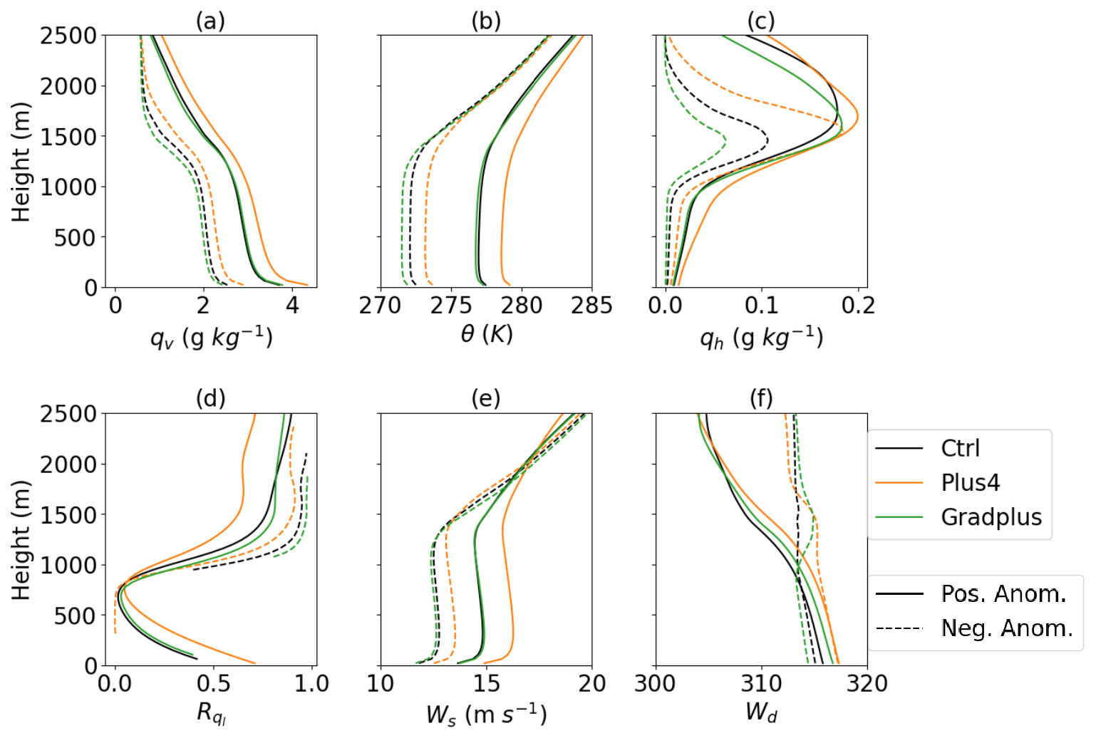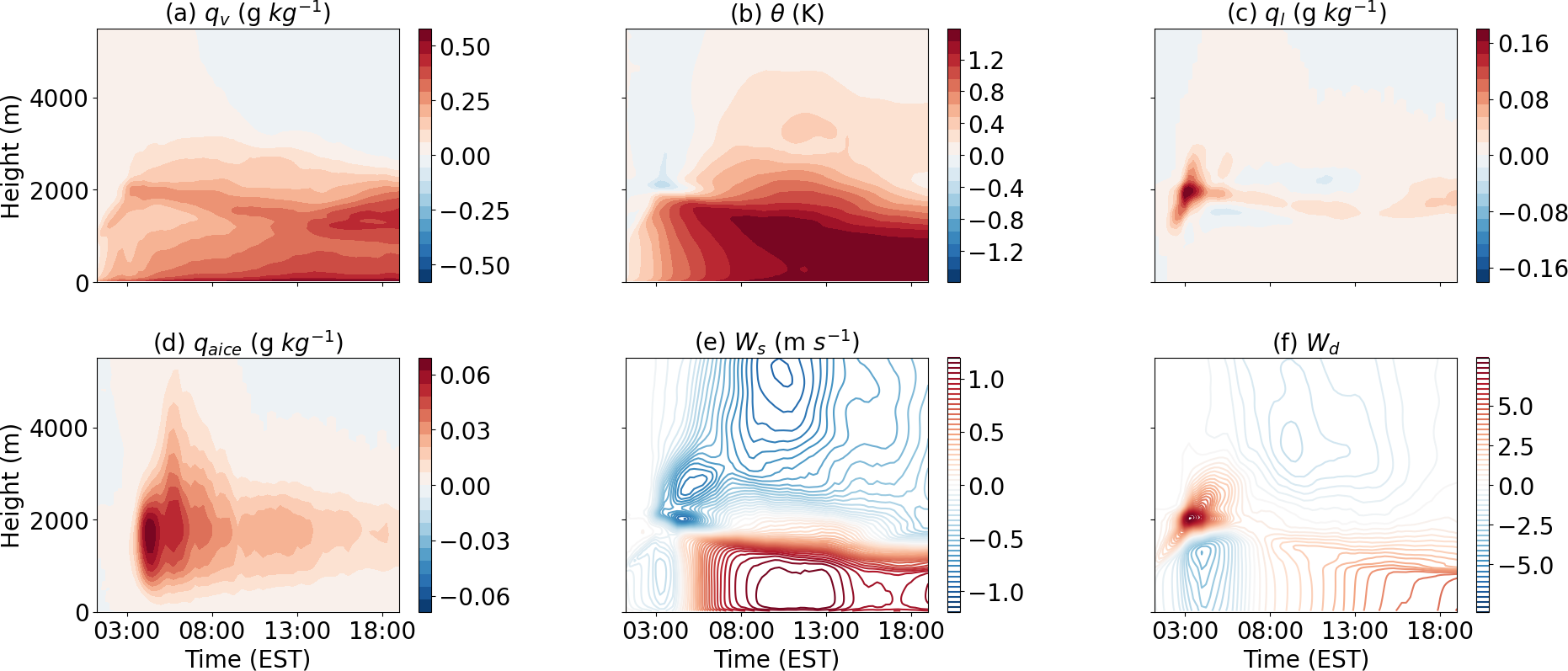 Figure 8Time series of the differences between the Plus4 and Ctrl experiments. Color shading indicates (a) qv, (b) θ, (c) liquid water mixing ratio (ql), (d) mixing ratio of all ice (qaice), (e) wind speed (Ws), and (f) wind direction (Wd).