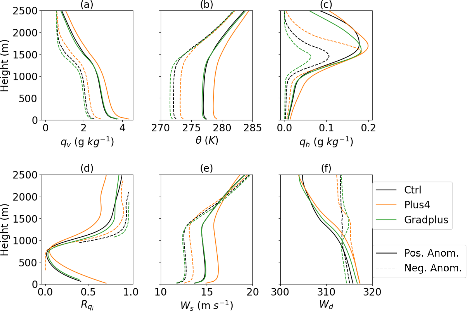 Figure 7Vertical profile of (a) water vapor mixing ratio (qv), (b) potential temperature (θ), (c) hydrometeor mixing ratio (qh), (d) the ratio of ice-phase hydrometeor to liquid-phase hydrometeor (Rql), (e) wind speed (Ws), and (f) wind direction (Wd) at 09:00 EST.