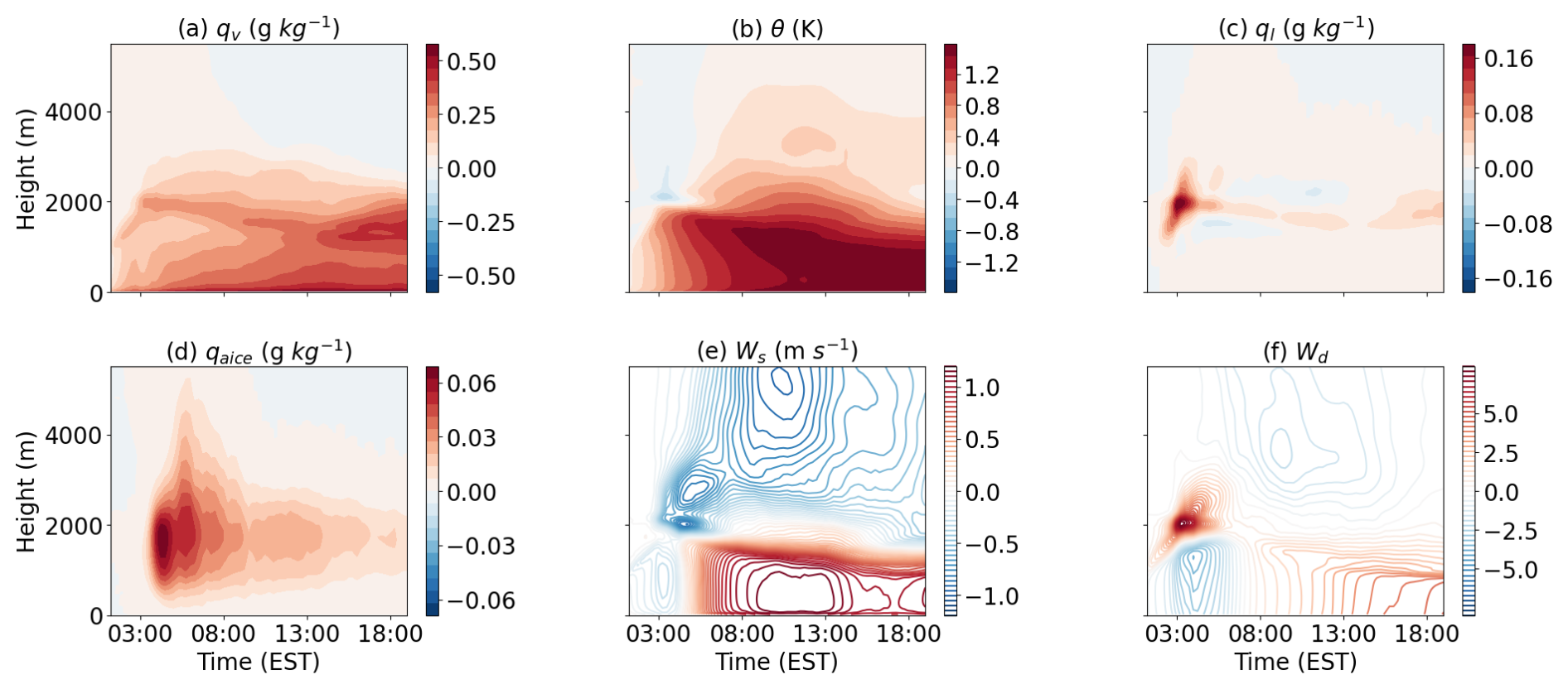 Figure 8 displays the time series of differences between the Plus4 experiment and the Control simulation. The elevated boundary layer qv, θ, cloud liquid and ice water mixing ratio, and wind speed persist from sunrise to sunset. In the early morning before sunrise, liquid-phase cloud content is slightly higher in the Plus4 experiment, but the differences diminish after sunrise. The all-ice-phase hydrometeor content in Plus4 is significantly larger than in the Control experiment, suggesting that the higher SST promotes deeper cloud development.