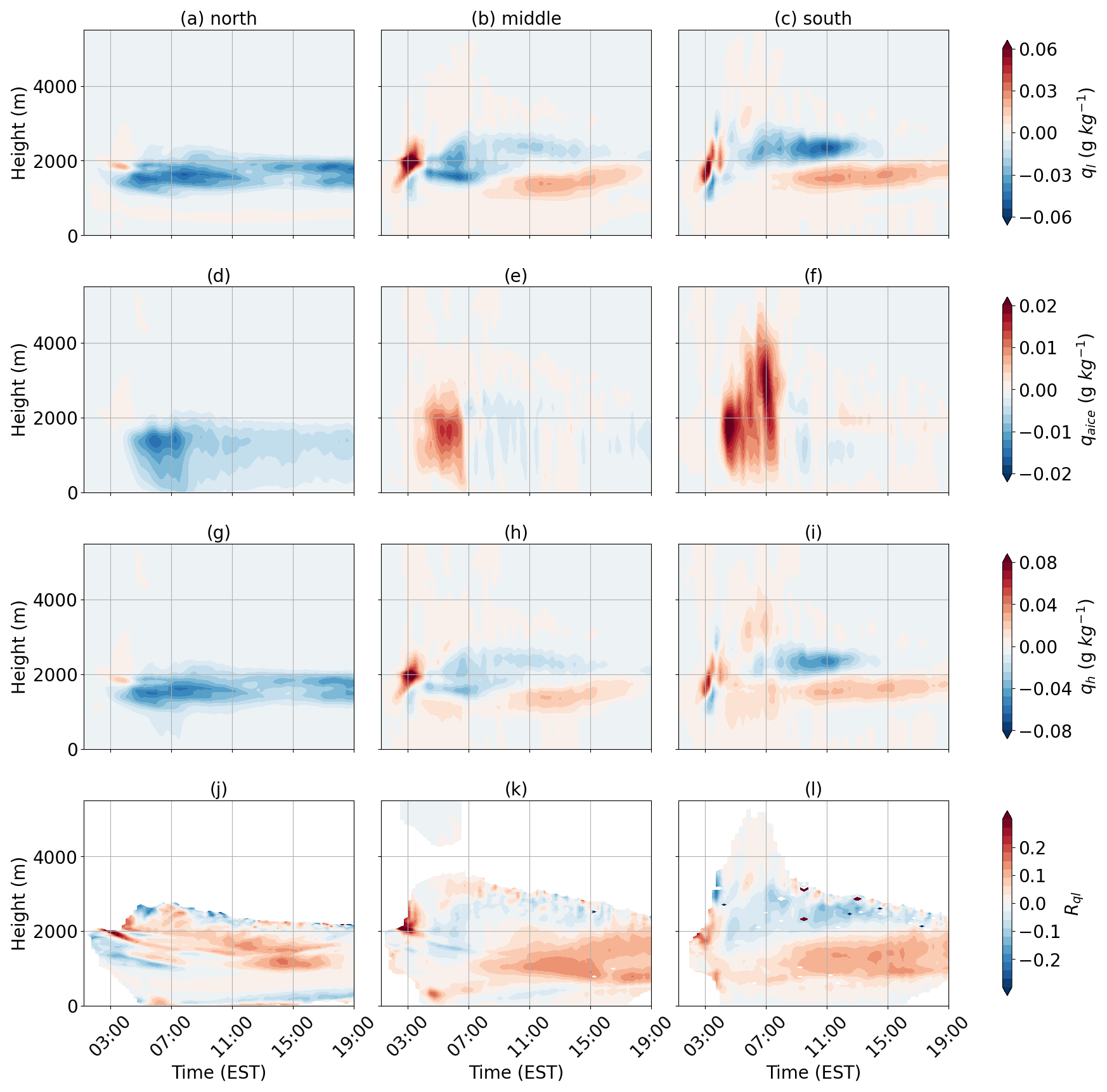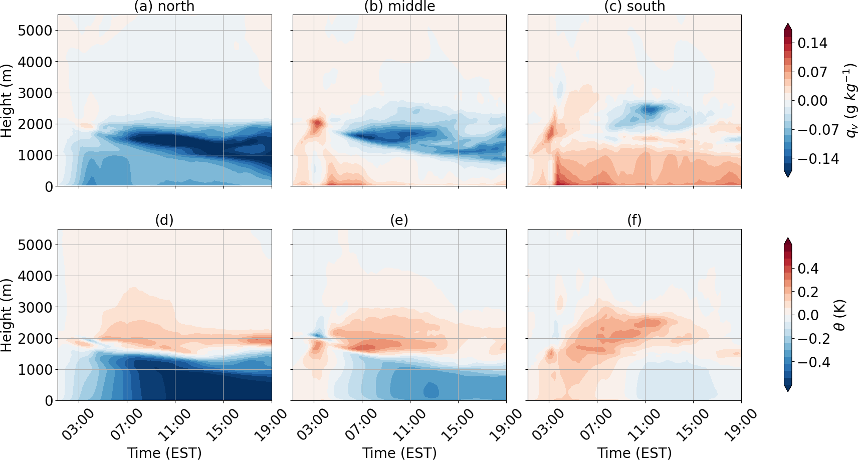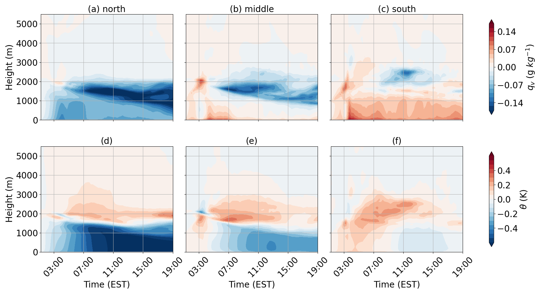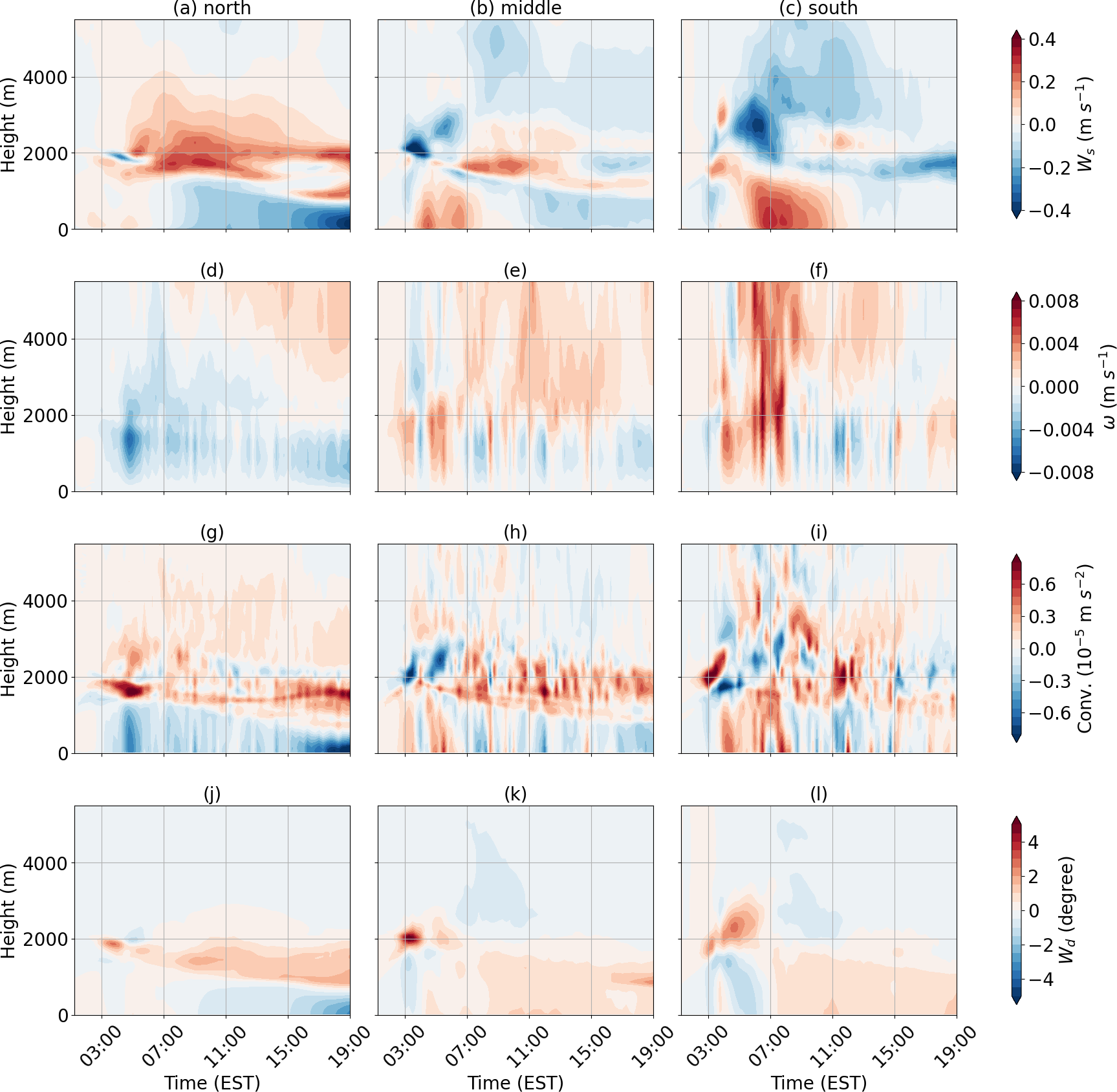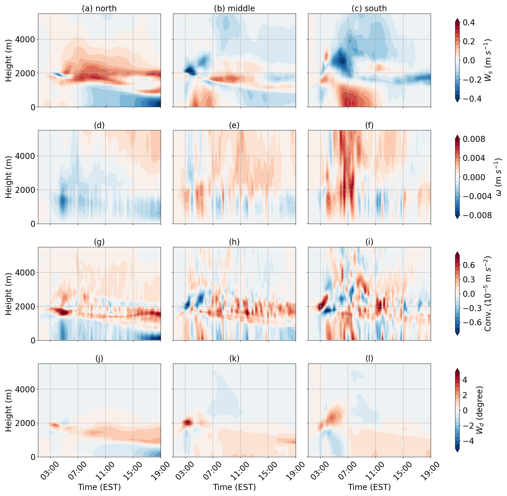However, despite stronger advection observed above the boundary layer, vertical transport of colder air is largely confined to the boundary layer in the northern region (Fig. 9d), leaving positive anomalies at higher altitudes. Meanwhile, stronger convection lifts warm air from the surface to above the boundary layer between 04:00 and 08:00 EST in the southern region (Fig. 10e–f). Stronger convergence observed during 04:00–08:00 EST in the southern region aligns with the enhanced vertical velocity (Fig. 10g–i). This suggests that transport of thermal energy is from south to north, opposite to the direction of moisture transport.