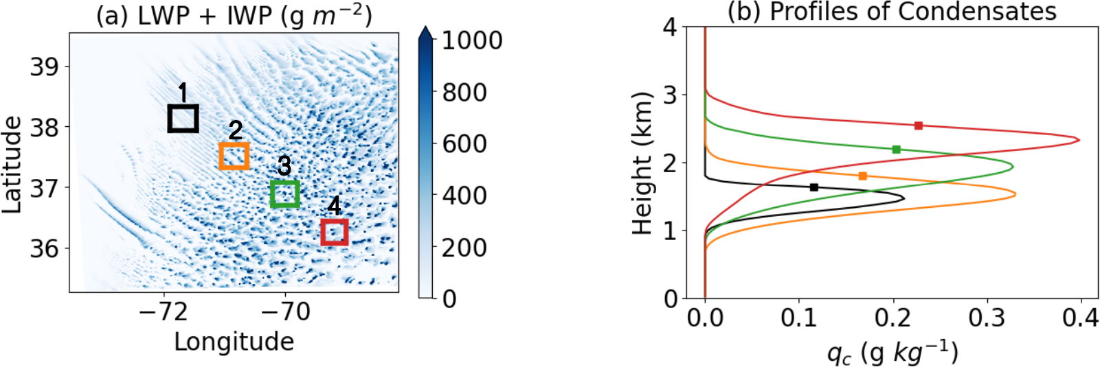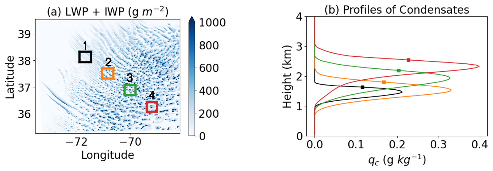 Figure 12(a) Total (liquid and ice) water path at 09:00 EST on 1 March 2020. Black, orange, green, and red boxes are the four locations where tracers are released. (b) Averaged profiles of cloud condensate mixing ratio (qc) within the four boxes in panel (a). Squares denote the heights where tracers are released in Fig. 13.