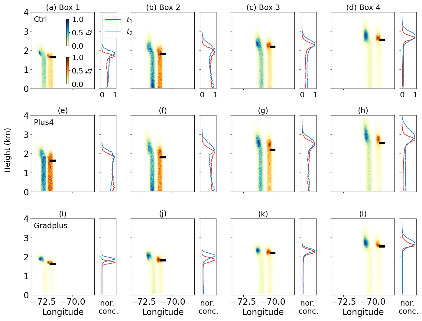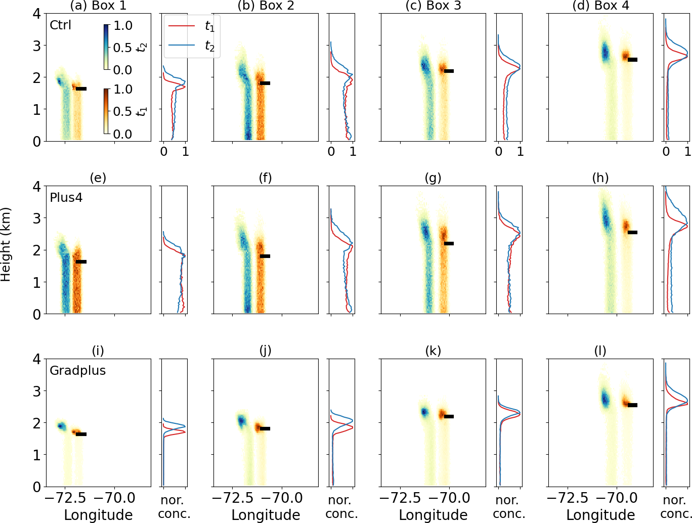 Figure 13Profiles of normalized tracer concentration by the total number of each trajectory run averaged at each longitude (left side of each panel (a)–(l)) and over the entire domain (right side of each panel (a)–(l)) for tracers released midway between the maximum qc and cloud top. The horizontal black bar denotes the tracer release location. In each row, panels from left to right correspond to release locations in Boxes 1–4 (see Fig. 12a). Rows from top to bottom represent results from the Ctrl, Plus4, and Gradplus experiments. The warm color (red) represents 30 min prior to the release time (t1) and the cold color (blue) represents 2 h prior to the release time (t2).