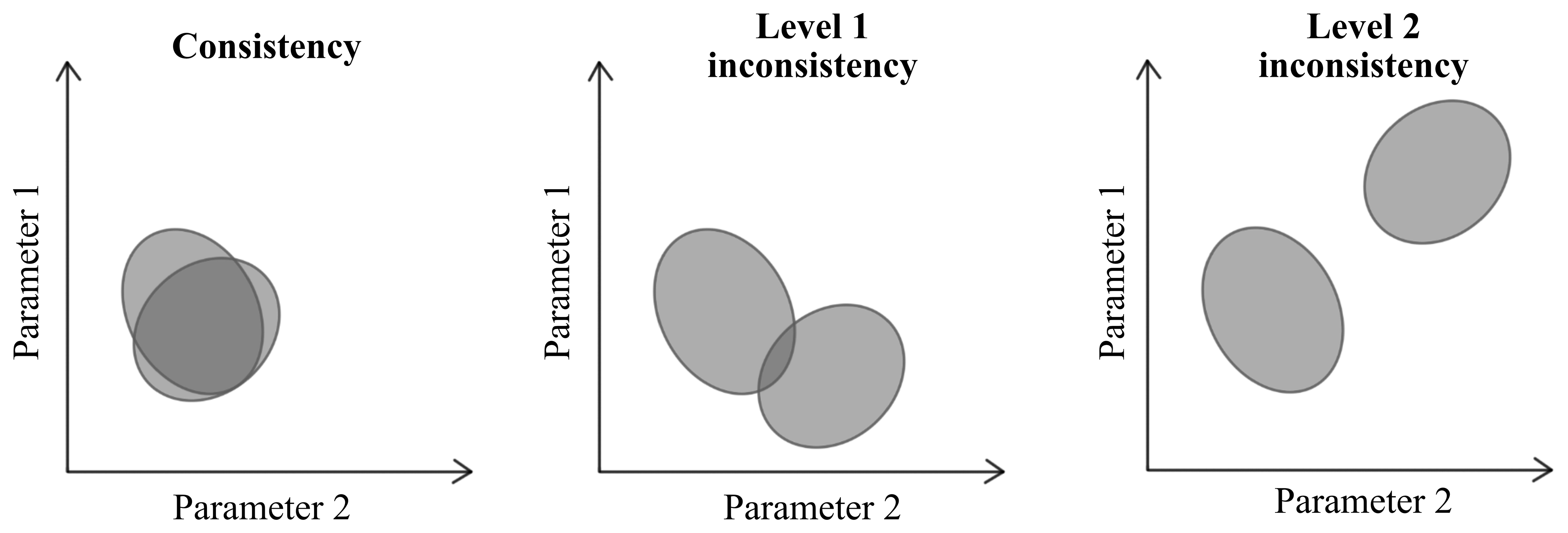 Figure 1Schematic showing the possible levels of inconsistency between two observational constraints. The shaded regions are the parts of parameter space that match one observation type. The diagram only represents the 2-dimensional aspects of what is in our case a 37-dimensional problem.