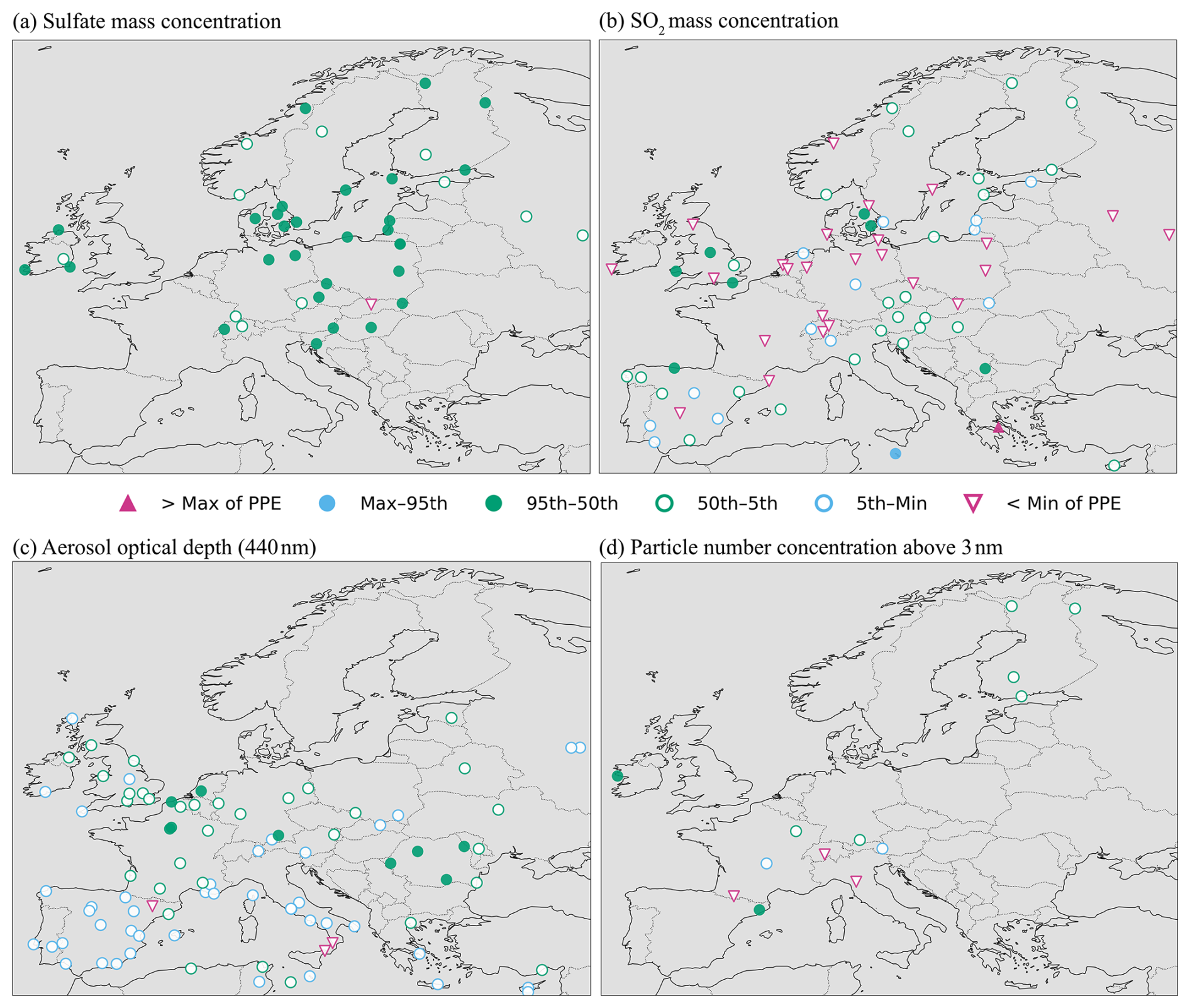 For N3 (Fig. 3d), most observations are within the PPE range; however, three observations from Southern France, Switzerland, and Northern Italy are below the PPE distribution, indicating that all PPE members overestimate particle number concentration at these sites. In addition, two nearby observations are positioned near the lower edge of the PPE range (between the 5th percentile and the distribution boundary), which suggests that modelled N3 is consistently overestimated in this region.