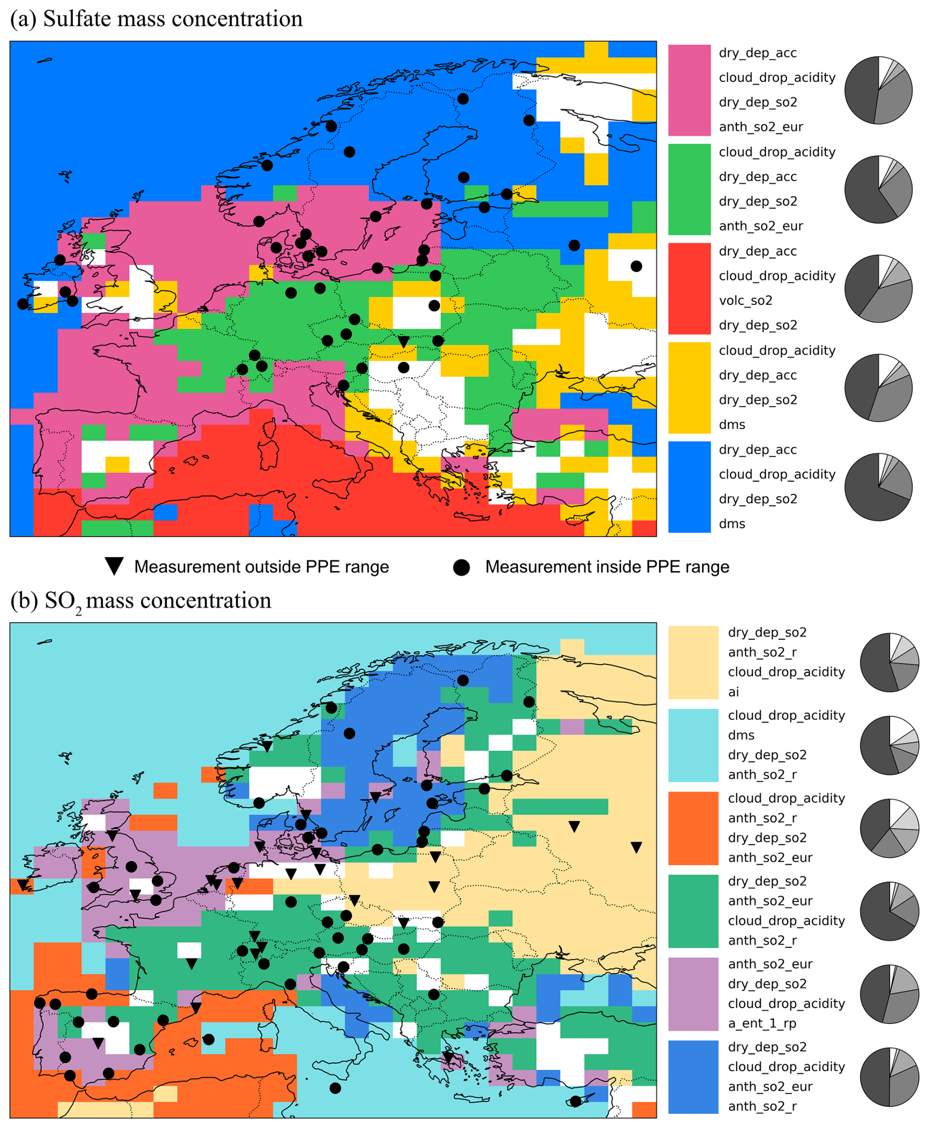 Figure 4Clusters of shared causes of parametric uncertainty for (a) sulfate concentration and (b) SO2 concentrations in January 2017. Based on the sample of around 900 000 model variants (parameter combinations) after removing prim_so4_diam < 10 nm. The legend identifies the first 4 key parameters driving uncertainty in each cluster. The percentage of variance caused by each parameter is shown in the pie charts, displayed anticlockwise from most to least important. Masked grid boxes (in white) indicate regions where emulator uncertainty exceeds the spread of the emulated response, see Fig. B1.