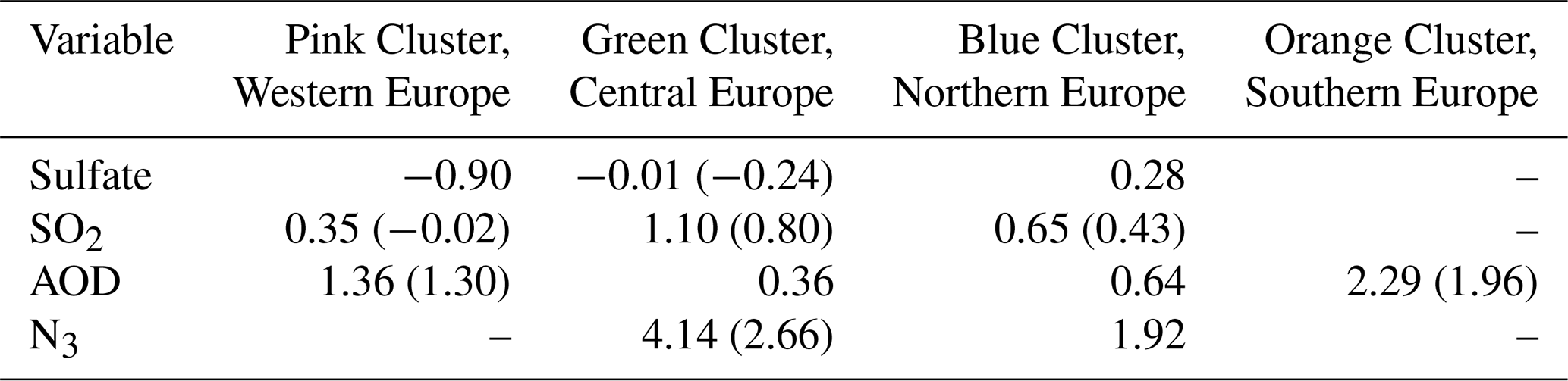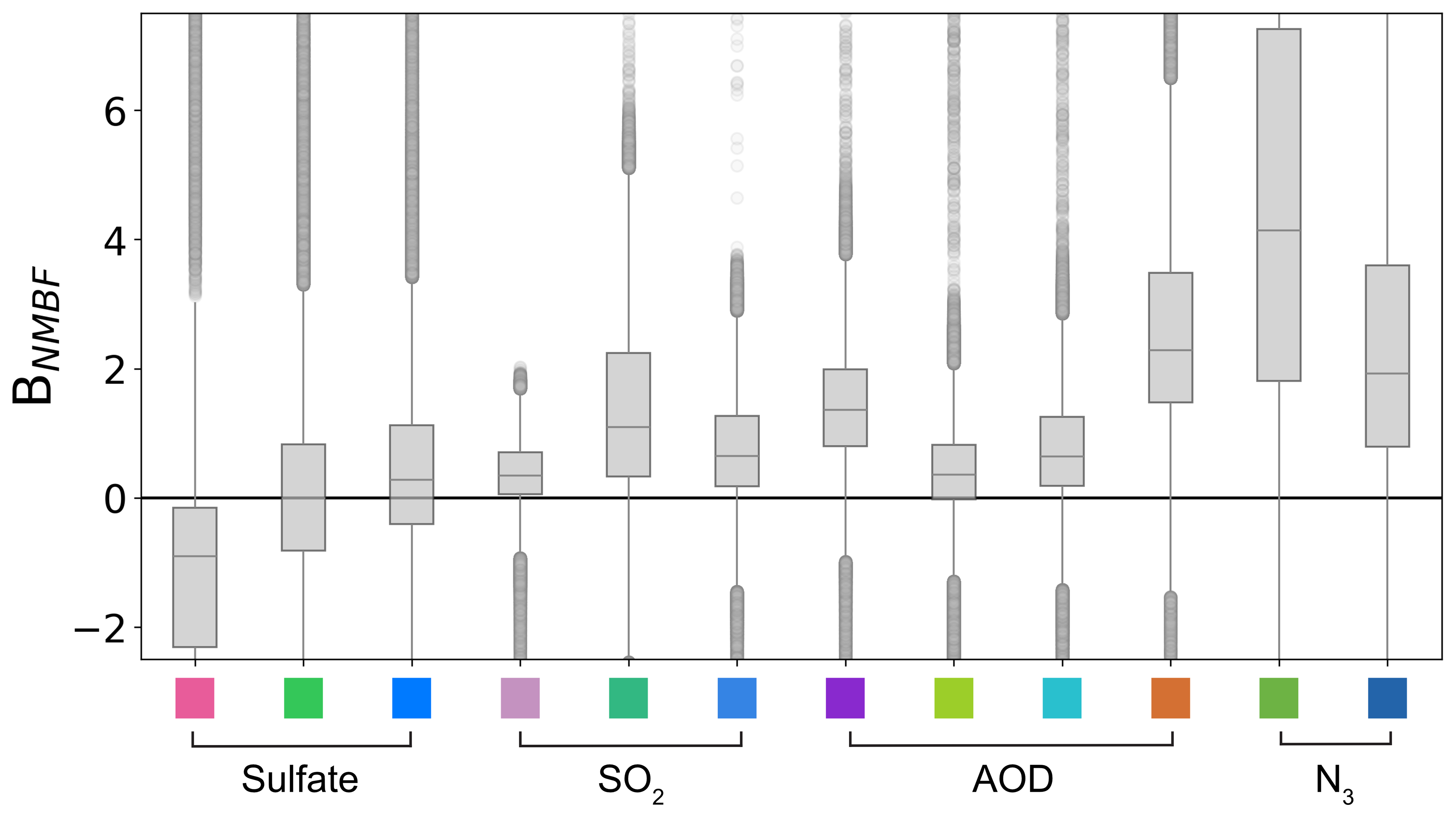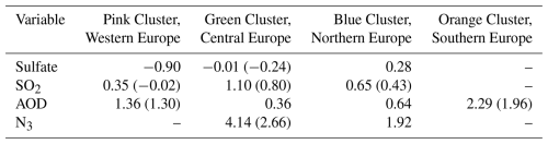 Figure 6 shows boxplots indicating the distribution of BNMBF across the 1 000 000 emulated model variants for each variable, within their respective uncertainty clusters: pink (Western Europe), green (Central Europe), blue (Northern Europe), and orange (Southern Europe). Although clusters do not map exactly onto the same region for each variable, we refer to them in this way for ease of comparison. The largest biases are in N3, AOD and SO2 which are all biased high in the model on average. For sulfate, there is more regional variation with some clusters biased high and others biased low. While we highlight median biases (the horizontal line inside the box, and Table 1) to capture general tendencies, the full distributions of model variants span observed values, which suggests that consistent observational constraint across variables and regions remains feasible at this stage.