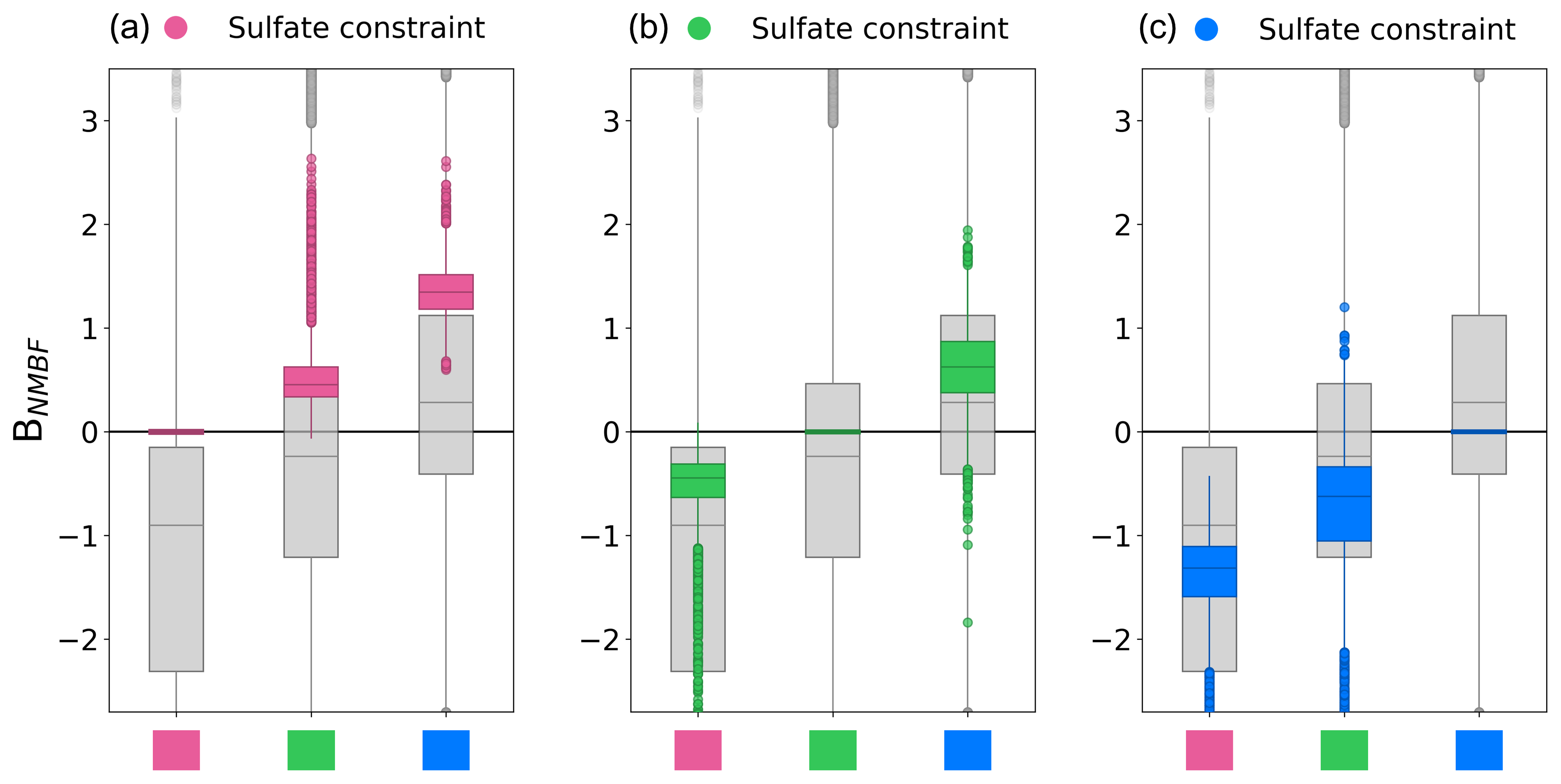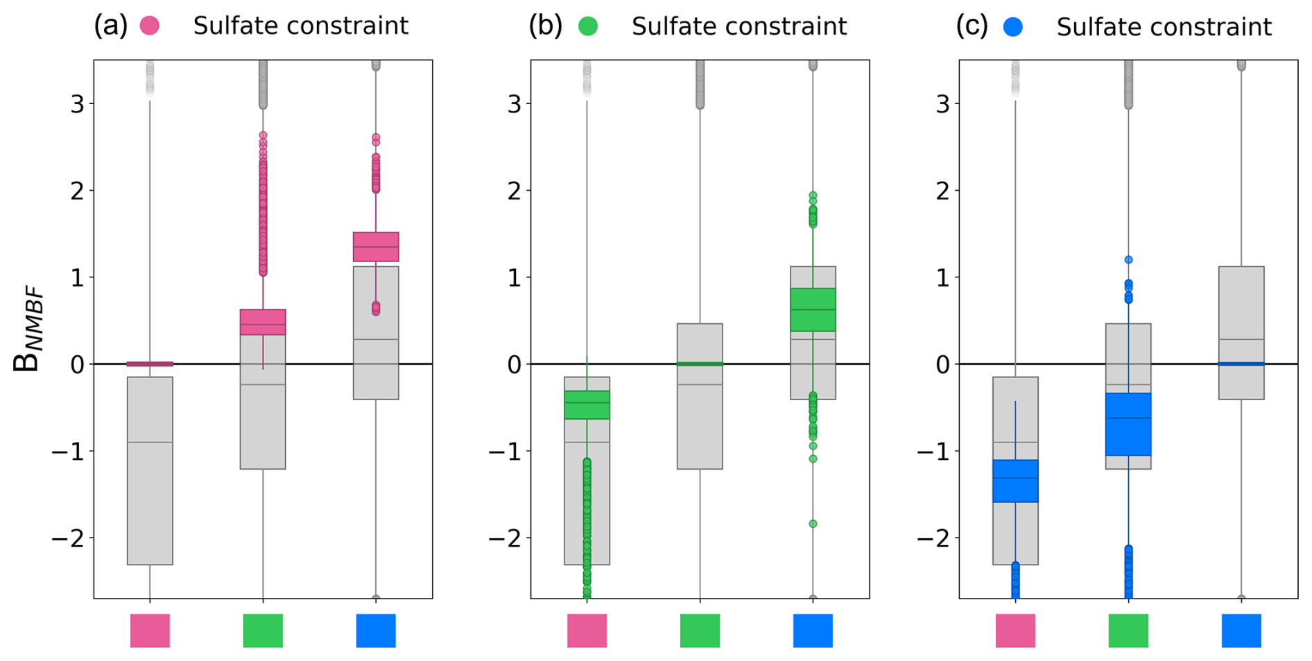 Figure 7Boxplots to show the effect of observational constraint on the distribution of the normalised model-observation mean bias factor (BNMBF) in sulfate concentration after observational constraint. The grey boxplots are identical to those in Fig. 6, for sulfate clusters in Fig. 4a. Overlaid coloured boxplots show the BNMBF distribution for the 5000 model variants closest to observations for sulfate mass concentration in (a) the pink cluster (Western Europe) and (b) the green cluster (Central Europe) and (c) the blue cluster (Northern Europe).
