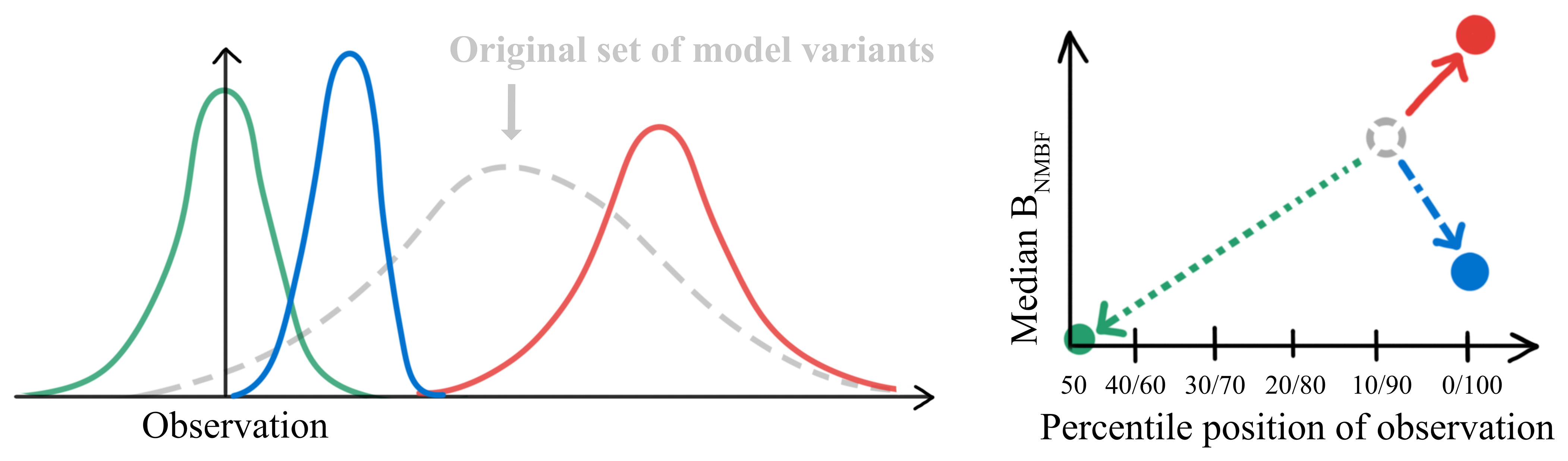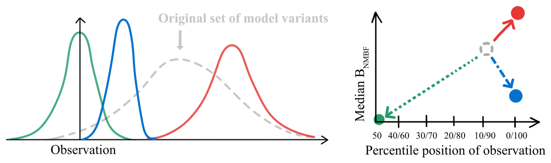 Figure 8Schematic illustrating the two metrics used to assess the effect of observational constraints on other variables and clusters: the median BNMBF (distribution shift) and the percentile position of the observation within the model distribution. Three example observational constraints are applied to the original set of model variants in dashed grey. The green distribution shows a case where both metrics improve; the red shows both worsening; and the blue shows an improvement in median BNMBF (higher precision) but a shift in the observation's percentile position away from the distribution centre (lower accuracy).