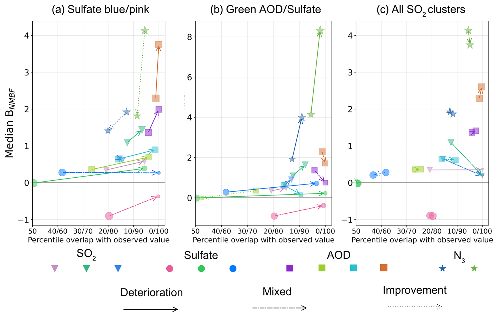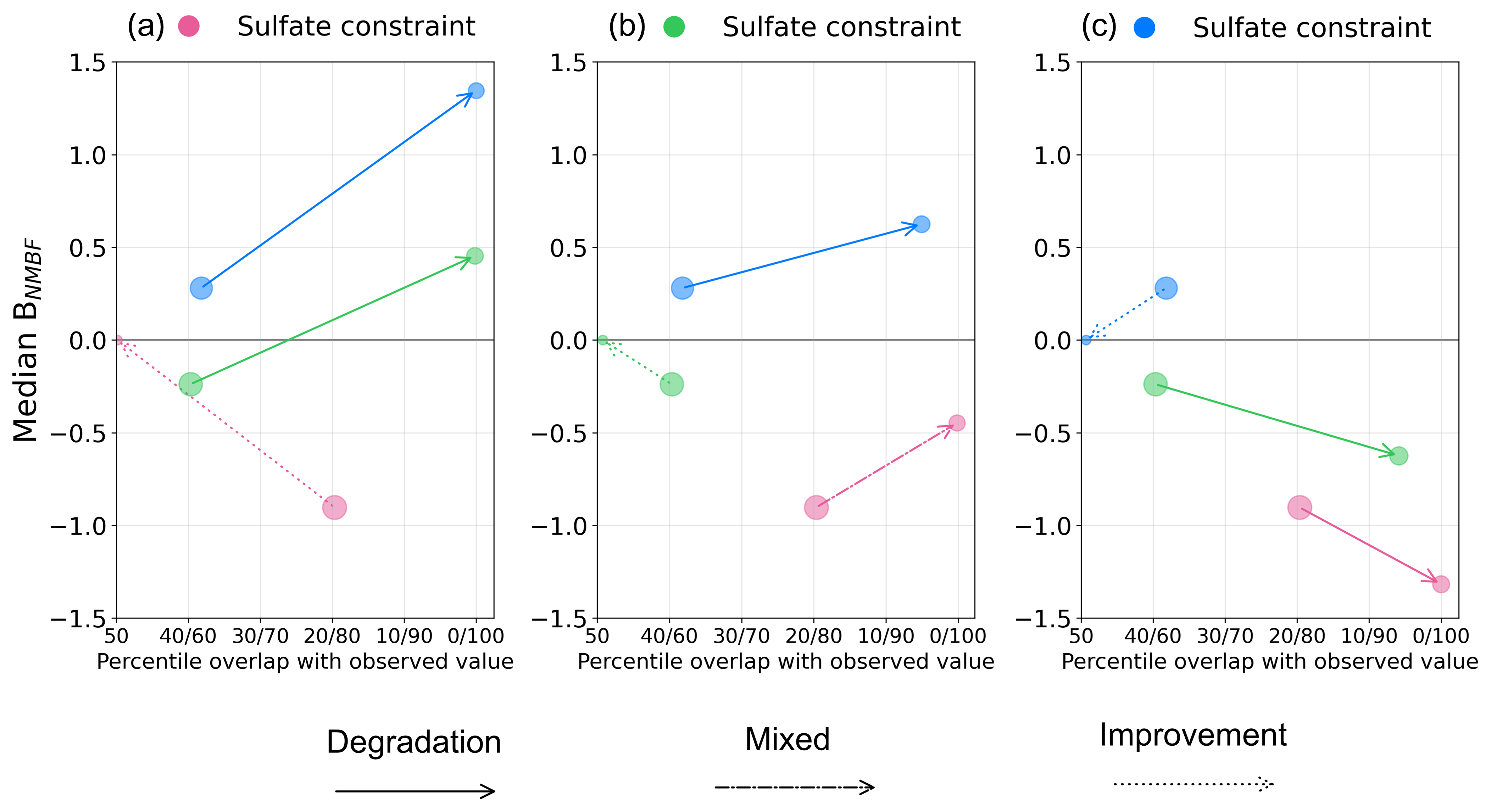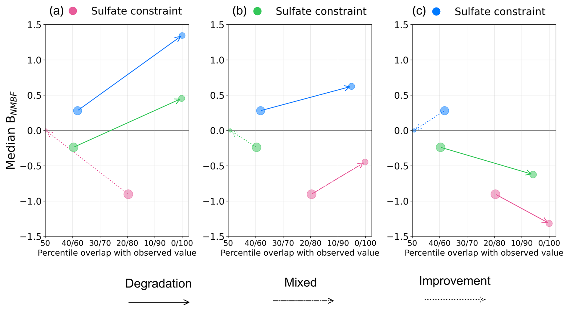 Figure 9Effect of regional sulfate observational constraints on model performance in sulfate clusters. The x-axis represents the percentile of the BNMBF distribution across model variants at which the observed value is located. The y-axis shows the median normalised mean bias factor (BNMBF) of the distribution. Panels represent the effect of (a) constraint to the pink cluster, (b) constraint to the green cluster, and (c) constraint to the blue cluster, on all sulfate clusters. Arrows connect the positions of the unconstrained distribution (arrow start) to the observationally constrained distribution (arrow end). Arrow line styles indicate the constraint's effect: solid for degradation in both median BNMBF and percentile position of the observation, dotted for improvement in both, and dash-dot for improvement in one but degradation in the other. For any distribution of model values with a positive median BNMBF (model >observation), the observed value corresponds to a percentile less than 50 within that distribution (see Fig. 8).
