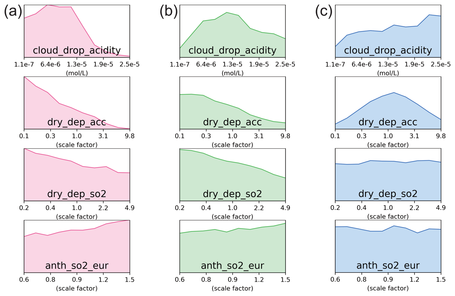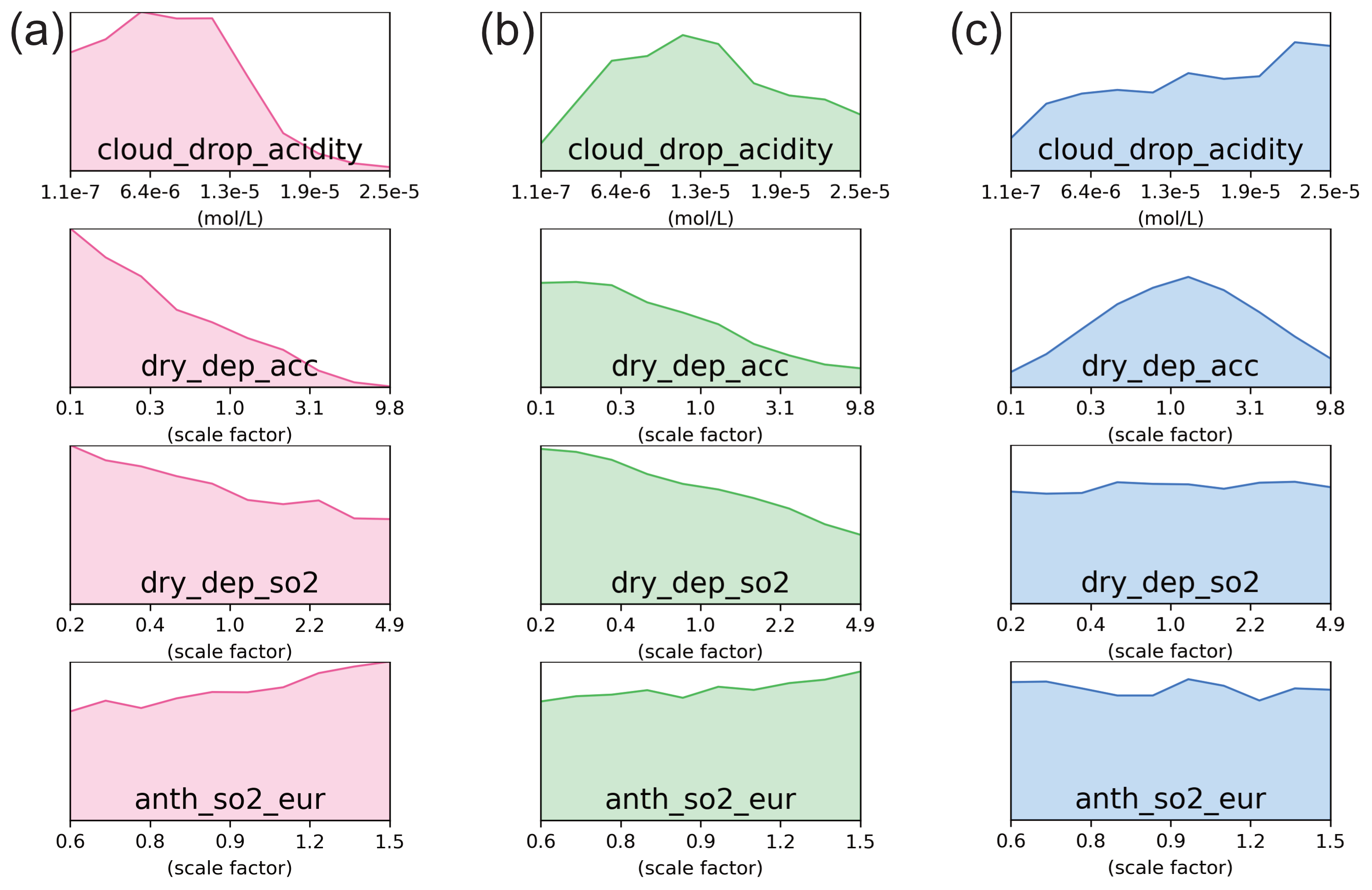 Figure D1Effect of compromise between observational constraints on other variables/clusters. (a) Compromise between the pink and blue clusters for sulfate concentrations, with marginal PDFs shown in Fig. C3 (422 model variants). (b) Compromise between AOD and sulfate in the green cluster, with marginal PDFs shown in Fig. C6 (298 model variants). (c) Joint constraint for the pink, green and blue cluster for SO2 concentrations, with marginal PDFs shown in Fig. C10 (386 model variants).