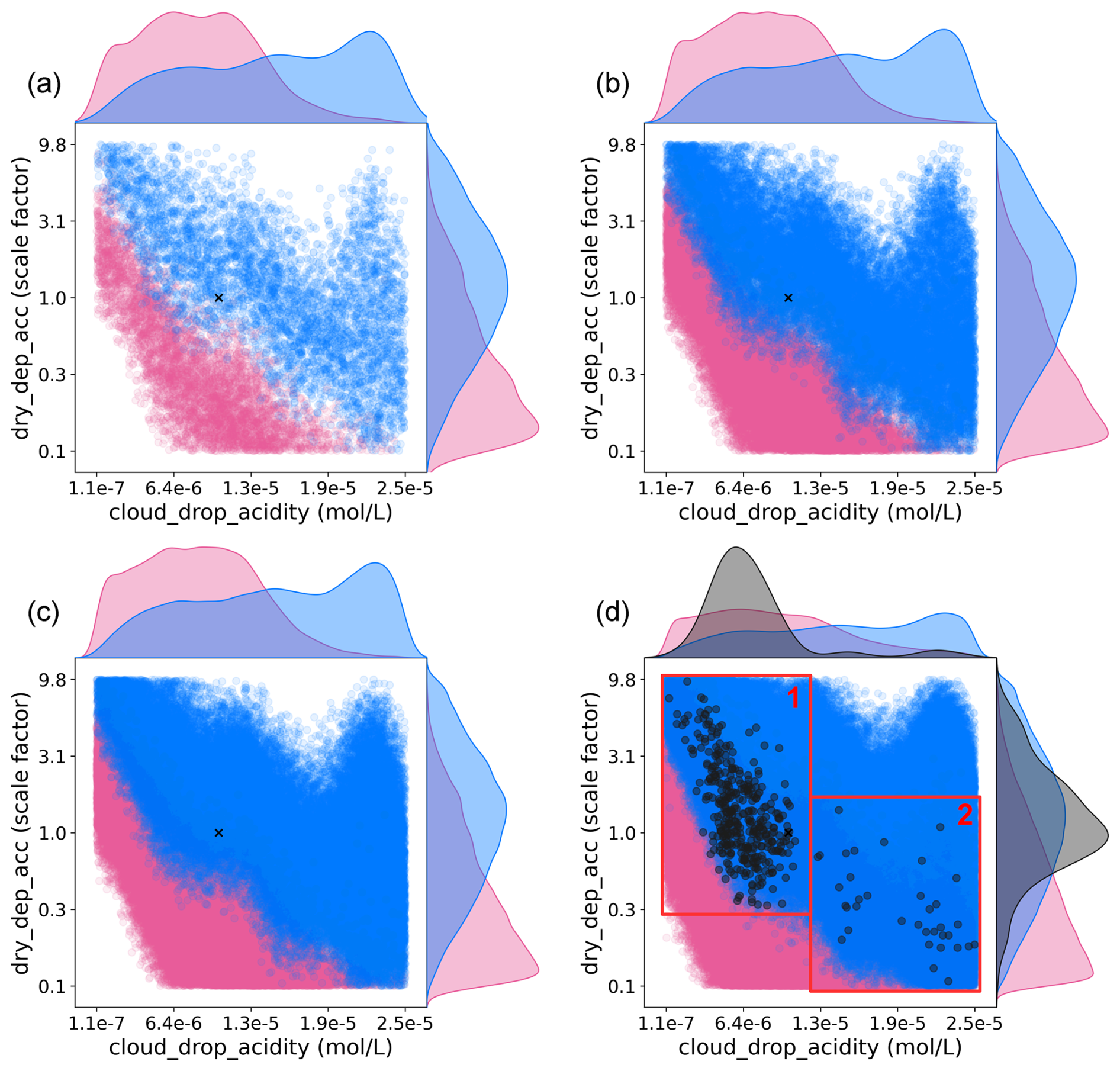 The opposing effects of these regional observational constraints clearly illustrate the model's inability to represent regional variations in sulfate concentrations simultaneously, even though the model simulations sample combinations of 37 parameters. Parameter combinations that improve agreement in one region entirely remove agreement in another: after applying observational constraints from either pink or blue clusters, the BNMBF distribution for the other no longer crosses zero. As a result, the model can either reproduce observed sulfate concentrations in Western Europe or in Northern Europe, but not both simultaneously, when using a global-mean approach to aerosol processes (which is the case with aerosol removal parameter, dry_dep_acc, and the cloud droplet acidity parameter, cloud_drop_acidity). The inability to identify parameter sets that simultaneously satisfy constraints across clusters is evidence of a level 2 inter-region structural inconsistency in sulfate concentrations (Sect. 2.7).